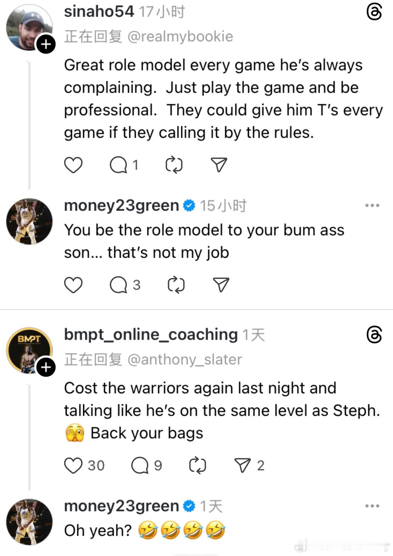 网友:真是个“好榜样”,每场比赛都在抱怨。好好打球、职业一点行不行?要是真按规则吹,他每场都能吃技术犯规。——追梦:你去给你那废物儿子当榜样吧……那不是我的工作。