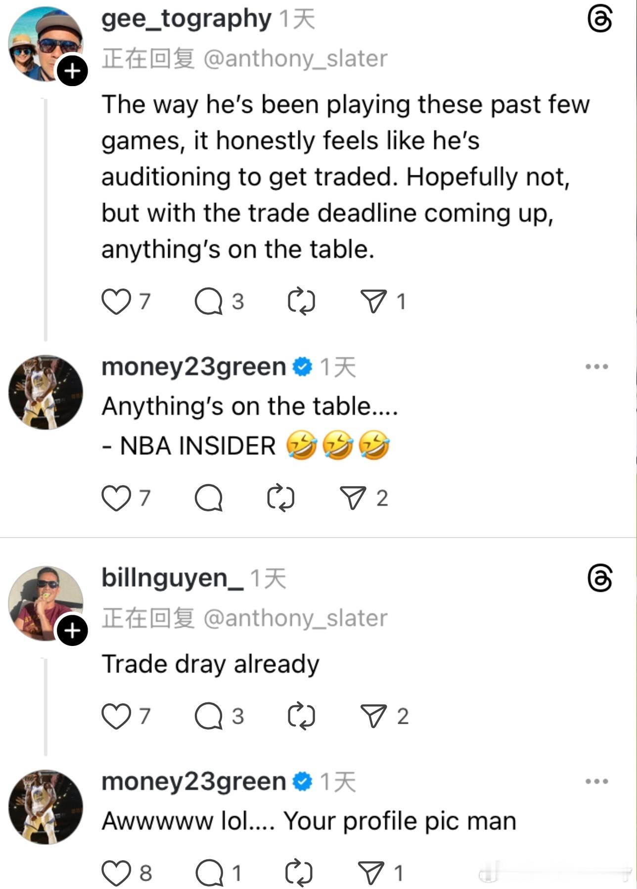 网友:他最近这几场的表现,说实话感觉像是在“试镜”被交易。希望不是吧,但交易截止日快到了,什么都有可能。——追梦:“什么都有可能……”——NBA 内幕人士 🤣🤣🤣(嘲讽对面装专家)
