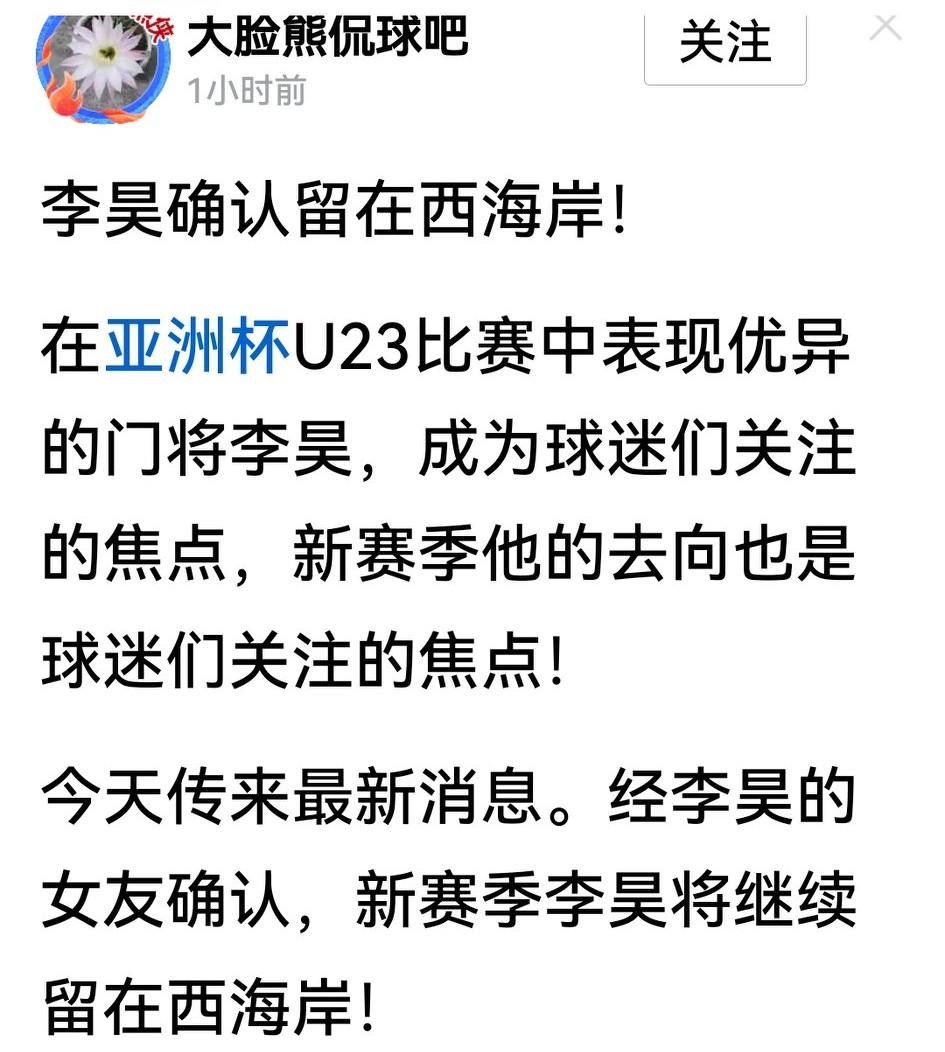 球员留队还是转会,常见官宣,少见自宣,罕见老婆宣,未见过女友宣,今天算长见识了,李昊留在西海岸,由其女友来宣。[捂脸] 凭借u23亚洲杯的神奇表现,都以为神一般存在的国足门将李昊不凡,要么留洋,要么为申花争冠,但今天刷到他女友在社交媒体宣布,李昊新赛季继续为青岛西海岸征战。 原来,在红颜面前,李昊是凡不是仙。[捂脸]
