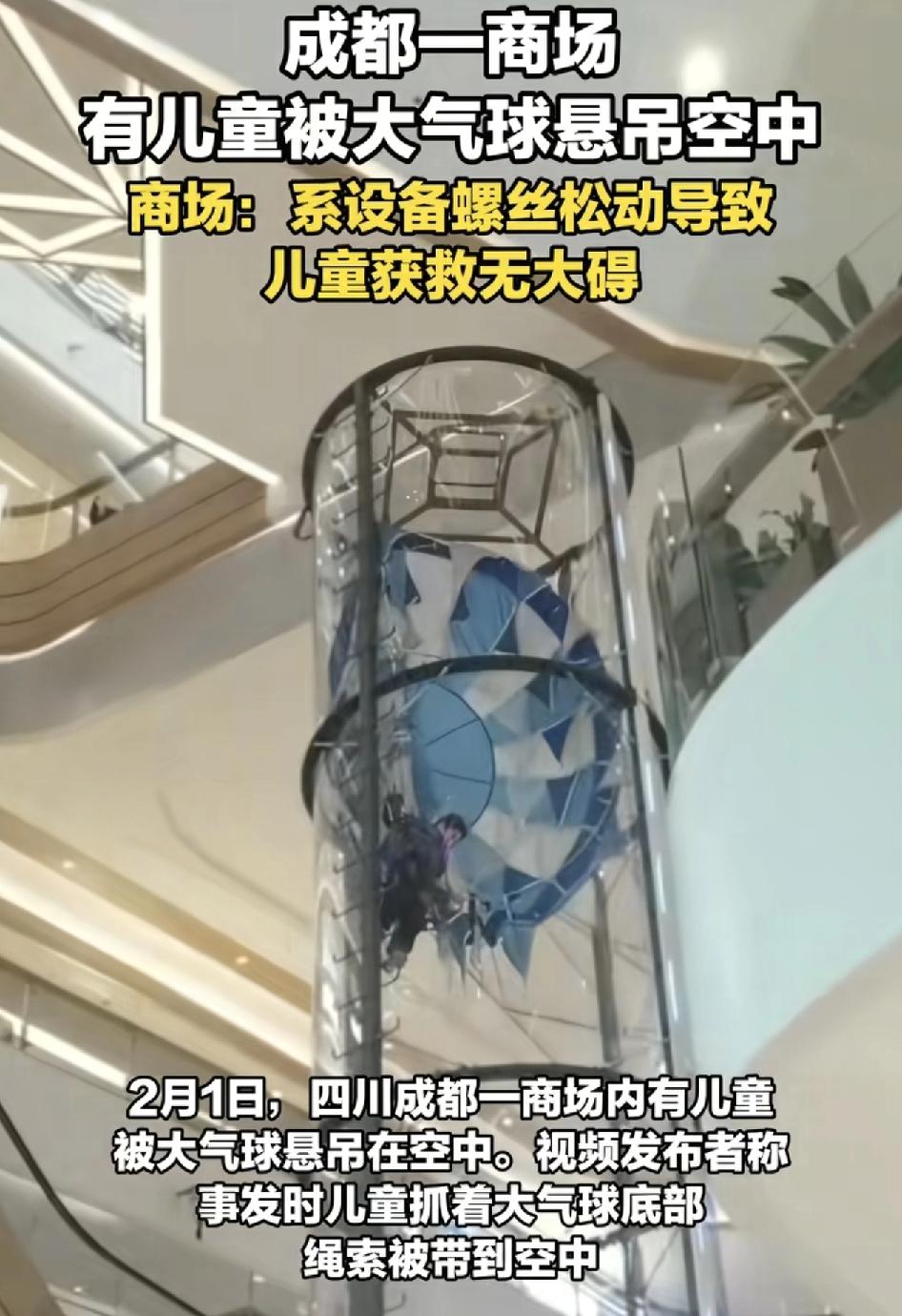 四川成都一商场内,一名男孩被一大气球悬挂在空中,消防员紧急到达现场,把安全绳慢慢的降下来,并且男孩成功获救,男孩经过检查身体无大碍。据了解,该大气球是商场内的装饰,男童在玩耍时,螺丝有松动,随后被带至空中,目前该气球已经进行检修。