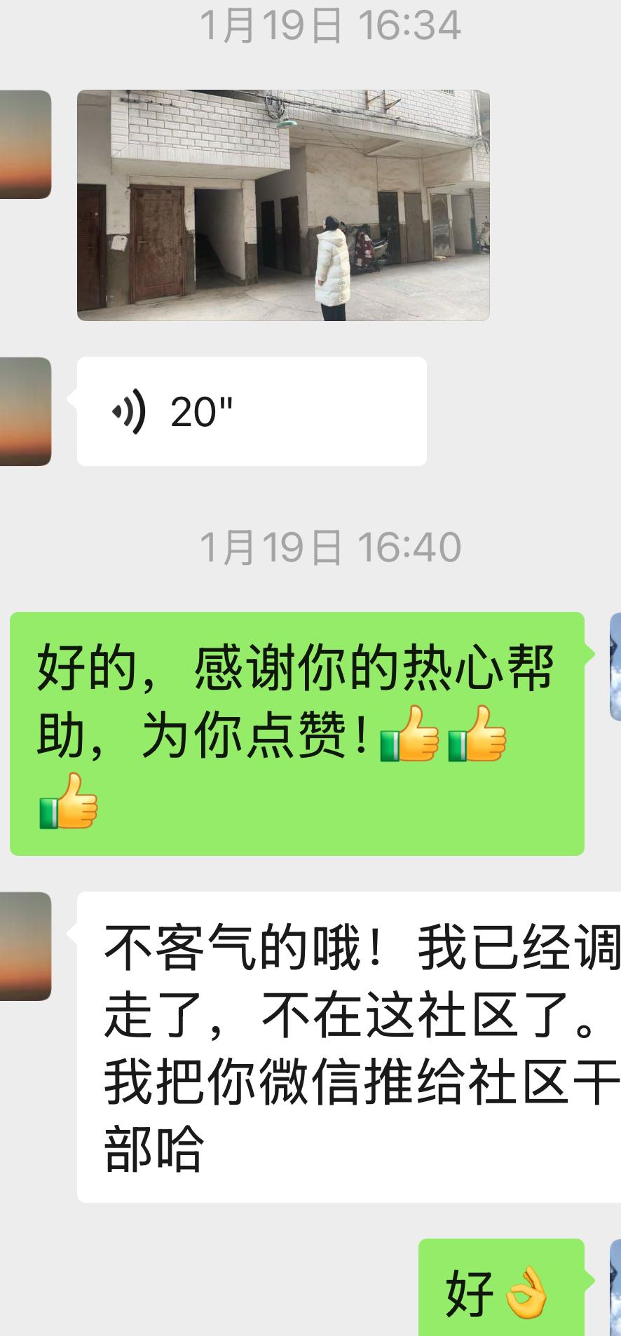中午一下楼,就发现楼道口的那盏坏了的路灯换上了新的路灯,真好! 这盏路灯坏了已经有一段时间了,天黑时上下楼很不方便,有些没有素质的路人还会趁着天黑在楼道口大小便。 我通过微信把这个情况反映给社区的一位领导,她很重视,把情况转发给社区的网格员,还亲自过来查看了一次,告诉我,过年前会修好,还告诉我,她已经调离这个社区,并热心地把我的微信推给了另一位社区领导。 这位社区领导,调离了我们这个社区,还把之前反映给她的社区问题妥善解决,真可谓在本社区站好了最后一班岗,把党群干部为人民服务的宗旨真正落到了实处,送她一朵小红花,必须为她发文点赞!