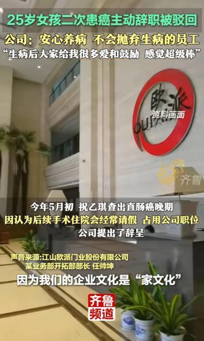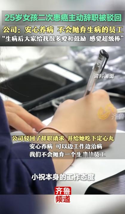 2024年,浙江25岁女孩患癌,跟公司提出辞职,公司领导却拒绝她的要求,谁料,公司接下来的做法让女孩泪流满面! 2024年的浙江,祝乙琪为了不耽误工作,选择从公司离职,但这个 25 岁的姑娘怎么也没想到,自己鼓足勇气递出的辞职信,会被领导直接驳回 1999 年祝乙琪出生在江山贺村镇农村,5 岁那年他被确诊肾母细胞瘤,本该在田埂上奔跑嬉笑的年纪,却一次次躺在医院的病床上接受化疗,最后为了保命,不得不切除了右肾。那道长长的手术疤痕,成了她童年最深刻的印记,也让她从小就比别人更懂事、更坚韧。 可命运的考验并未就此停止,11 岁那年,父亲突发脑溢血骤然离世,家里的顶梁柱轰然倒塌,留下她和年幼的弟弟,还有独自扛起生活重担的母亲。 2020 年,祝乙琪从宁波一所大专的文秘专业毕业,为了多赚点钱,她留在了宁波打拼,在一家私企做行政助理。 看着妈妈年纪大了,腰腿疼的毛病越来越严重,没法再干重活,2023 年下半年,祝乙琪毅然辞掉了宁波的工作,回到了江山,入职当地一家上市公司做办公室文员。 可这份安稳,终究被病魔打破了。2024 年 4 月底,祝乙琪开始莫名的腹痛,一开始她以为是吃坏了东西,随便买了点肠胃药吃。 没过几天,她突然在办公室疼得冷汗直冒,脸色惨白,同事们见状,赶紧开车把她送到了江山市人民医院。 一系列检查下来,结果让所有人都懵了:肠癌晚期,癌细胞已经转移到腹腔,暂时不具备手术条件,需要先进行化疗控制病情,仅前期六个化疗疗程的费用,就需要将近八万元。 拿着诊断报告的那一刻,祝乙琪没有嚎啕大哭,脑子里第一个冒出来的念头,竟是自己的工作。 她想着,自己这一病,最少要半年时间没法正常上班,岗位一直空着,会给公司的工作带来影响,也会让同事们分担额外的活。 自己总不能占着岗位白拿工资,思来想去,她觉得唯有辞职,才是最妥当的选择,既不拖累公司,也能让自己安心治病。 她走到领导办公室,把自己的病情和辞职的想法说了出来,她做好了被立刻批准的准备,甚至想好了面对同事时该说些什么。 可没想到,领导起初还以为是年轻人一时冲动想跳槽,略带责备地让她珍惜工作机会,可当看清辞职的原因,办公室里瞬间陷入了沉默。 祝乙琪低着头,不敢看领导的眼睛,心里五味杂陈,直到耳边传来领导温和却无比坚定的声音:“辞职我不批,你现在最重要的事就是安心养病,工作的事不用操心,岗位永远给你留着,公司不会抛弃任何一个生病的员工。” 经理当天就把祝乙琪的情况上报给了公司高层,5 月 19 号,公司内部就发起了爱心募捐,董事长带头捐了 5000 元,公司高管每人最少捐了 2000 元。 普通员工从 50 元、100 元到 500 元不等,就连公司食堂的阿姨、门口的保安大叔,都主动凑了份子钱。 短短三天时间,公司上下一共为祝乙琪筹得了 98620 元的善款,财务部门直接把这笔钱转到了她的银行卡里,没让她操一点心。 公司还特意为祝乙琪制定了专属的休假方案,人事部门明确告知她,治疗期间工资全额发放,五险一金正常缴纳,所有的节日福利、员工体检等权益,一个都不会少。 考虑到她后续化疗需要频繁往返医院,公司还跟她约定,只要身体条件允许,她可以在家处理一些简单的线上工作,其余时间全权安心养病,不用有任何工作上的顾虑。 平日里和祝乙琪朝夕相处的同事们,也用自己的方式默默守护着她。 知道她要频繁去医院,同事们主动分担了她手里的所有工作,原本属于她的文案整理、文件归档,都被大家有条不紊地接手,没有人有一句怨言。 这份来自公司和同事的温暖,成了祝乙琪对抗病魔最坚实的底气。她不再是那个独自面对命运考验的姑娘,在她的身后,有一群温暖的人,用自己的方式为她撑起了一片天。 对于这件事,您有什么想说的吗?欢迎评论区留言讨论。 信源:齐鲁频道2024-10-21——《浙江衢州。25岁女孩二次患癌主动辞职被驳回,公司:安心养病不会抛弃生病的员工……》