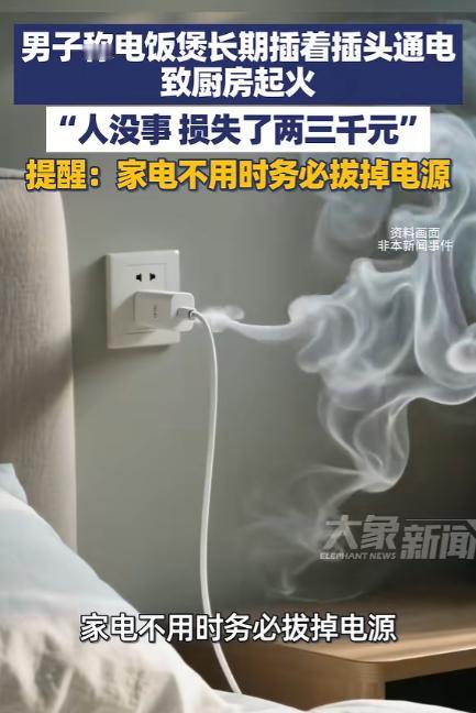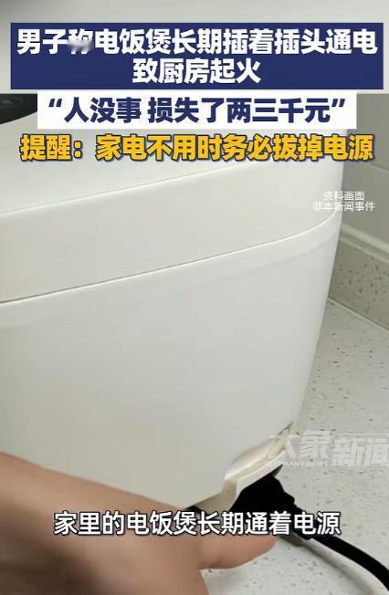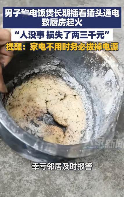 1月29日报道,四川眉山。一名男子用电饭煲做饭后,忘记了拔插头,于是长期插着插头通电,没想到下班回家后竟发现家中一片狼藉,本以为失窃却不想是厨房起火了,好在邻居及时报警才没造成人员伤亡。网友:家电不拔插头太危险了! 1 月 29 日的四川眉山,傍晚的下班高峰刚过,市区某小区的居民楼里,一名男子正快步走在楼道中,可还没走到家门口,一股刺鼻的焦糊味就顺着门缝飘了出来,越靠近家门,味道就越浓烈,这让他心里瞬间揪了起来。 掏出钥匙匆匆打开家门,推开门的那一刻,眼前的景象让他瞬间懵了,客厅里还飘着淡淡的黑烟,地上散落着各种被熏得发黑的杂物,厨房的方向更是一片狼藉。 男子走到厨房门口,看到灶台上那台被烧得变形发黑的电饭煲,以及天花板上被火燎过的痕迹,他才反应过来,家里起火了。 慌乱中男子赶紧查看屋内情况,好在火势已经被扑灭,没有蔓延到客厅和其他房间,也没有造成人员伤亡。 事后他才知道,是隔壁邻居发现他家厨房的窗户不停往外冒黑烟,察觉情况不对后立刻报了警,消防员赶到现场后迅速展开扑救,才让火势没有进一步扩大。 等现场的烟雾慢慢散去,男子开始清点家中的损失,原本好好的电饭煲彻底报废,厨房的橱柜被烧得有些变形,台面上的锅碗瓢盆不少被熏坏甚至烧坏,还有一些厨房常用的小电器也因为火灾受了损,前前后后算下来,总共损失了两三千元。 男子看着被烧得一片狼藉的厨房,既庆幸又后怕,他坦言,当天中午自己用电饭煲煮了饭,吃完饭后因为急着去上班,一时疏忽就忘了拔下插头。 想着电饭煲的保温功能一直开着也没什么事,就这么让它一直通着电,没想到这一个小小的疏忽,竟然引发了火灾。 这起因电饭煲长期插电引发的厨房火灾,并不是个例,近期各地都有类似的家电使用不当引发的安全事故。 就在前不久,浙江嘉兴也发生了一起几乎一模一样的事故,房主将电饭煲通了一整夜的电,结果引发火灾,电饭煲起火后还引燃了旁边的凳子等家具,屋内被烧得一片狼藉,所幸扑救及时,没有造成人员伤亡。 而在 1 月 29 日当天,北京石景山区也有一户居民因电饭煲故障引发火灾,涉事的电饭煲是房主从二手交易平台低价购入的,最终火势蔓延导致住户被困,所幸被消防救援人员成功救出,才避免了更严重的后果。 消防部门此前曾公布过一组数据,在各类家庭火灾中,因电器故障引发的火灾占比超过 30%,其中厨房小家电的安全问题尤为突出。 像电饭煲、电磁炉、电水壶这类日常高频使用的电器,一旦使用和维护不当,就很容易成为隐藏的火灾隐患。 很多人都和眉山这名男子一样,有着家电不用却不拔插头的习惯,总觉得电器处于待机或者保温状态,既不怎么耗电,也不会有什么安全问题。 可实际上,电器在待机时,内部的线路和元件依然处于工作状态,会持续产生热量,长期下来会加速线路绝缘层和各类部件的老化,时间久了就容易出现线路短路、温控失灵等问题,进而引发火灾。 就像电饭煲这类厨房电器,若是长期插电处于保温状态,发热盘会持续处于低热状态。 若是平时不注意清理,发热盘上堆积的米粒、油污等杂物会影响散热,导致局部温度过高,一旦超过线路和部件的耐受限度,就可能引发绝缘层融化,产生短路火花。 而如果电饭煲本身的发热盘材质劣质、线路设计不合理,或者温控系统失灵,长期插电的情况下,还可能出现持续加热的情况,最终引燃电饭煲内部部件,进而引发火灾。 厨房本身就是油烟多、易燃物集中的地方,电饭煲旁边通常会摆放食用油、纸巾、抹布等物品,一旦起火,火势很容易快速扩散,造成难以挽回的损失。 不光是电饭煲,生活中很多常见的家电,长期不拔插头都存在不小的安全隐患,贵州遵义就有一户人家,出门时忘了拔下手机充电器。 结果充电器长期插电发热引发火灾,不仅自家的房子被烧成了废墟,火势还蔓延到了楼下,导致楼下住户也遭受了不小的损失,最终房主还需要承担相应的赔偿责任。 火灾的发生往往源于疏忽,看似不起眼的小习惯,可能就是引发危险的导火索。 守住用电安全的底线,从改掉不拔插头的小习惯开始,时刻提高安全警惕,做好日常的防范和检查,才能从源头杜绝火灾隐患,守护好自己和家人的生命财产安全。 对于这件事,您有什么想说的吗?欢迎评论区留言讨论。 信源:大象新闻2026-01-29——《1月29日(报道)四川眉山,男子称电饭煲长期插着插头通电致厨房起火:人没事 损失了两三千元……》