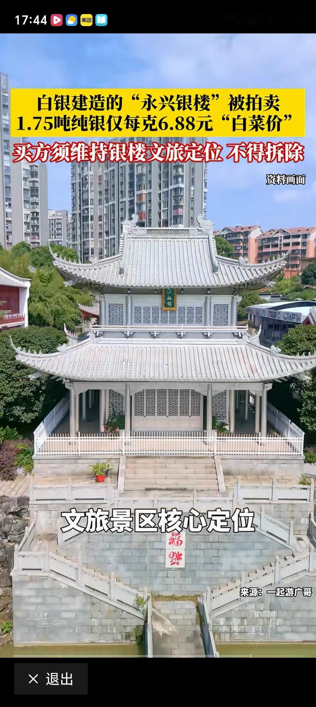 如何看待湖南永兴县的“永兴银楼”拍卖流拍 湖南永兴县的“永兴银楼”拍卖流拍,这事挺让人意外的。这银楼用了1.75吨纯银,评估价值1204万,算下来每克才6.88元。要知道2026年银价都涨到29元/克了,按市价这银都值5000多万,妥妥的“白菜价”。 可为啥流拍呢?原来这不是单卖银料,而是和土地、建筑、景区打包拍卖,起拍价2509万。并且拍下后得维持“中国白银文化馆”定位,不能拆楼卖银。这就意味着买家买的不只是银楼,还得持续投入运营。所以,看似是“捡漏局”,实则背后规则断了投机者念想,流拍也就不奇怪了。
