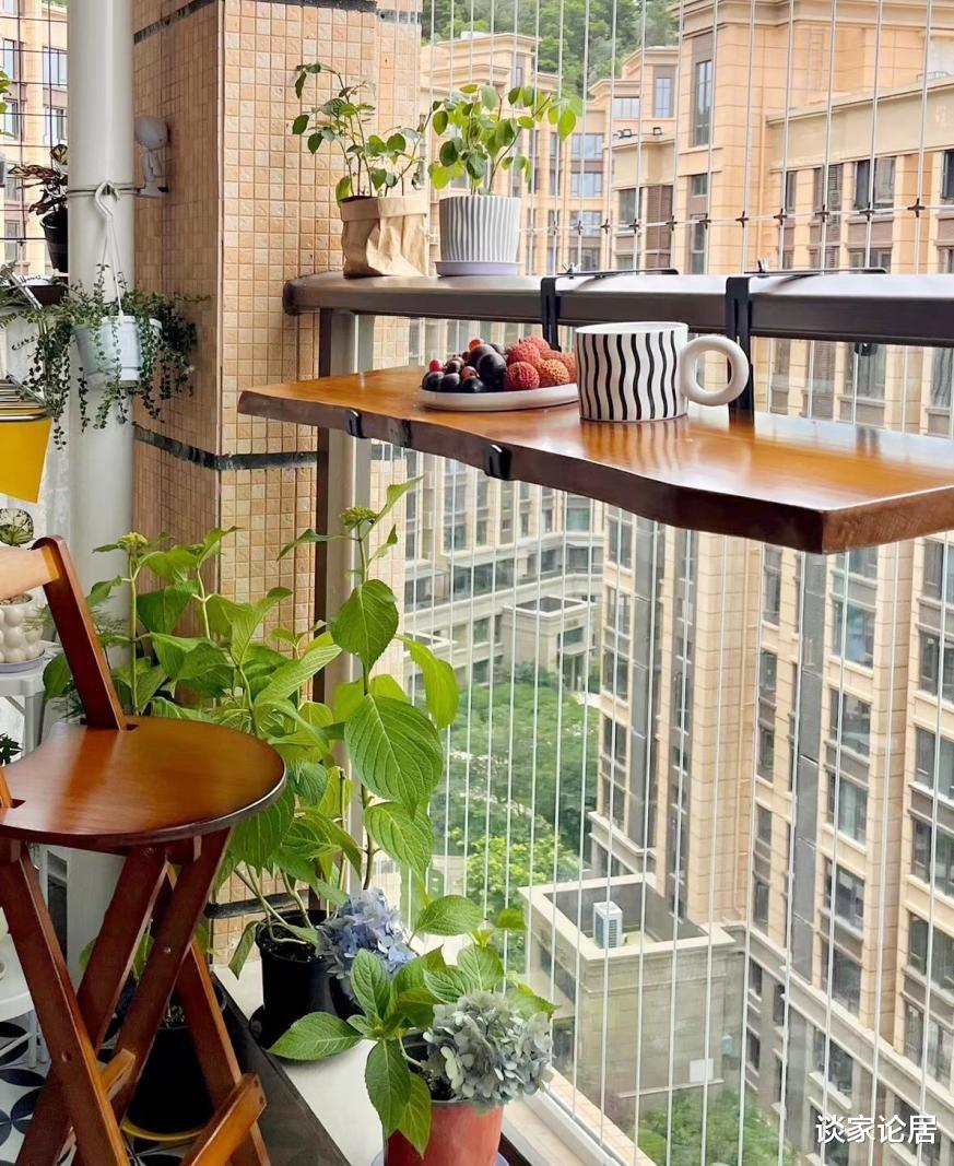 网友@小依琳的阳台是露天的,购买一张长1.2米厚木+金属支架的吧台和两张吧凳,台面和两侧放上绿植,就能营造一种自然的氛围。