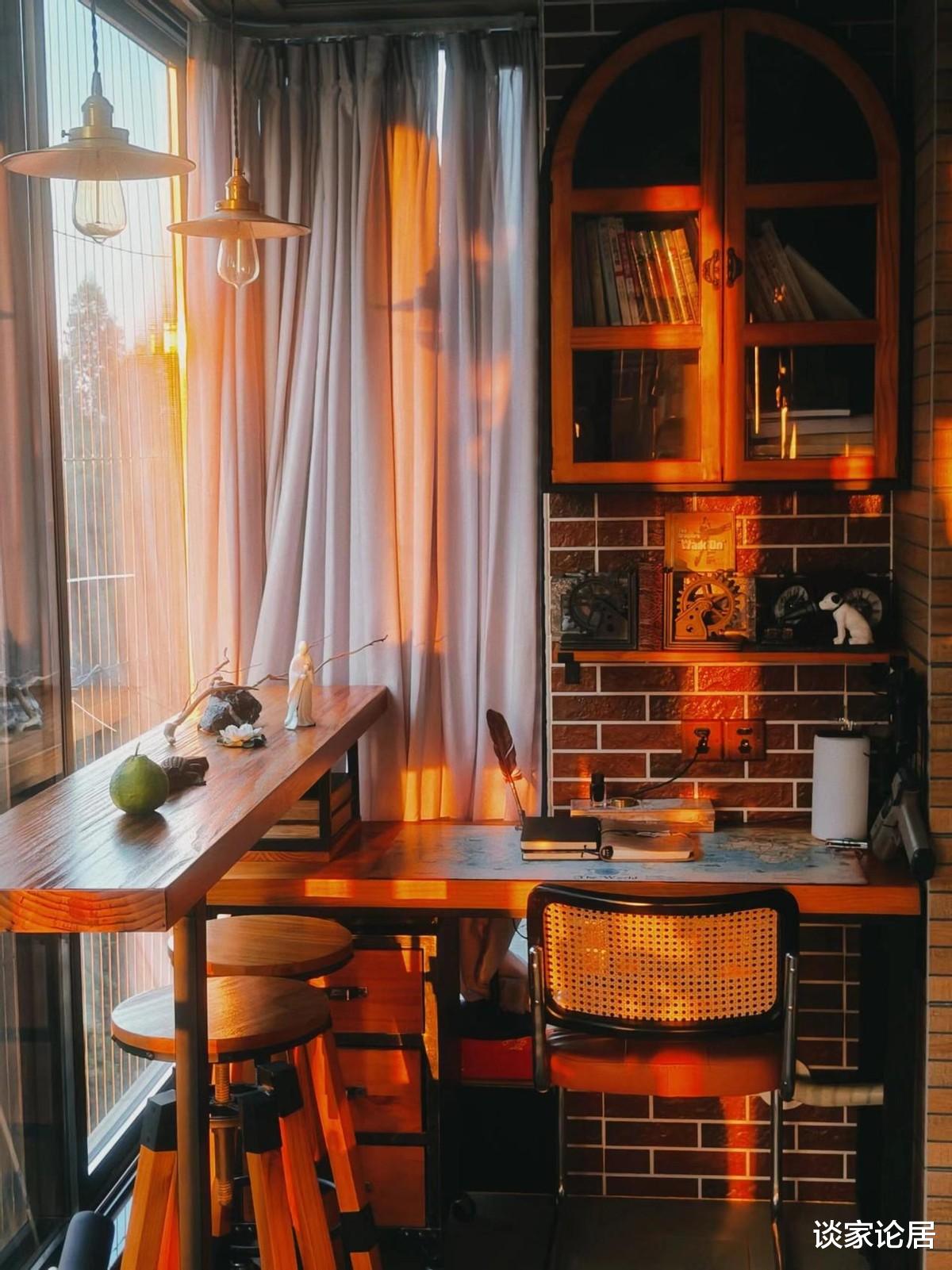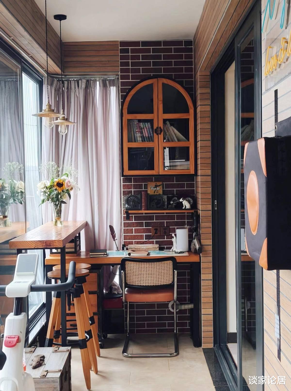 而且整体设计都以温润的原木色和红砖片,在阳台或灯光的照射之下,非常有氛围感!这样既满足了书房功能,也满足了吧台的休闲功能。