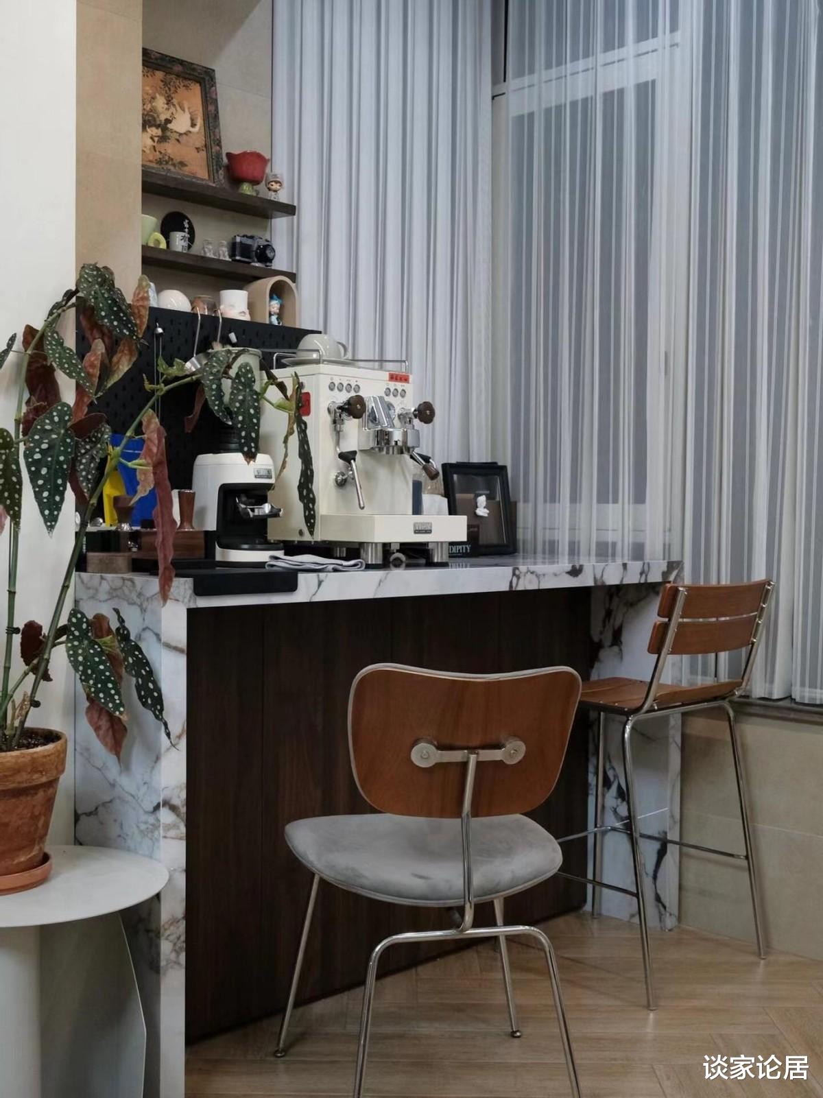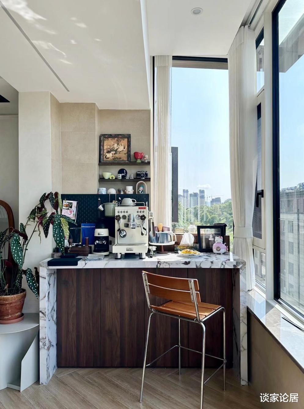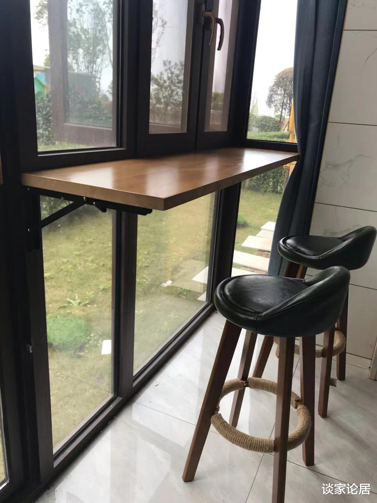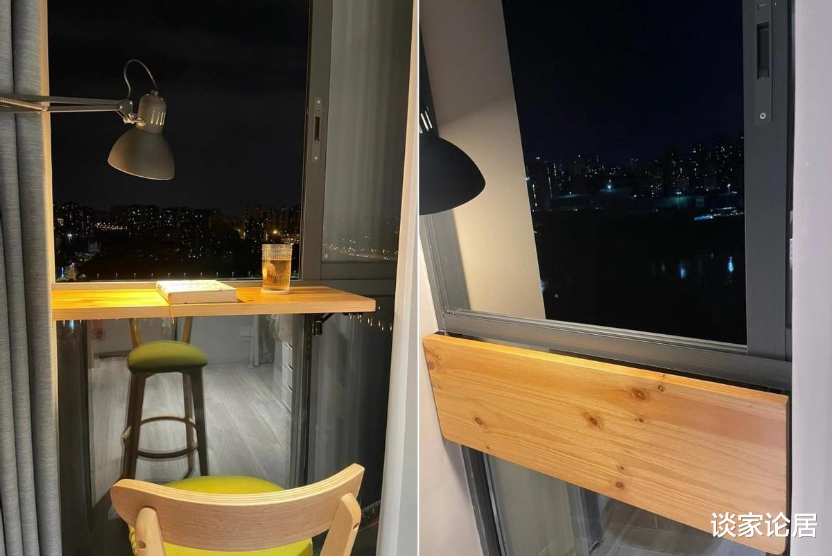 网友@sunny说,自从在封窗后的阳台安装了一张折叠吧台后,她每天晚上都会打开窗户,撑起吧台桌,坐在吧凳上,看着户外的风景,泡上一壶茶,一坐就可以坐一个晚上。