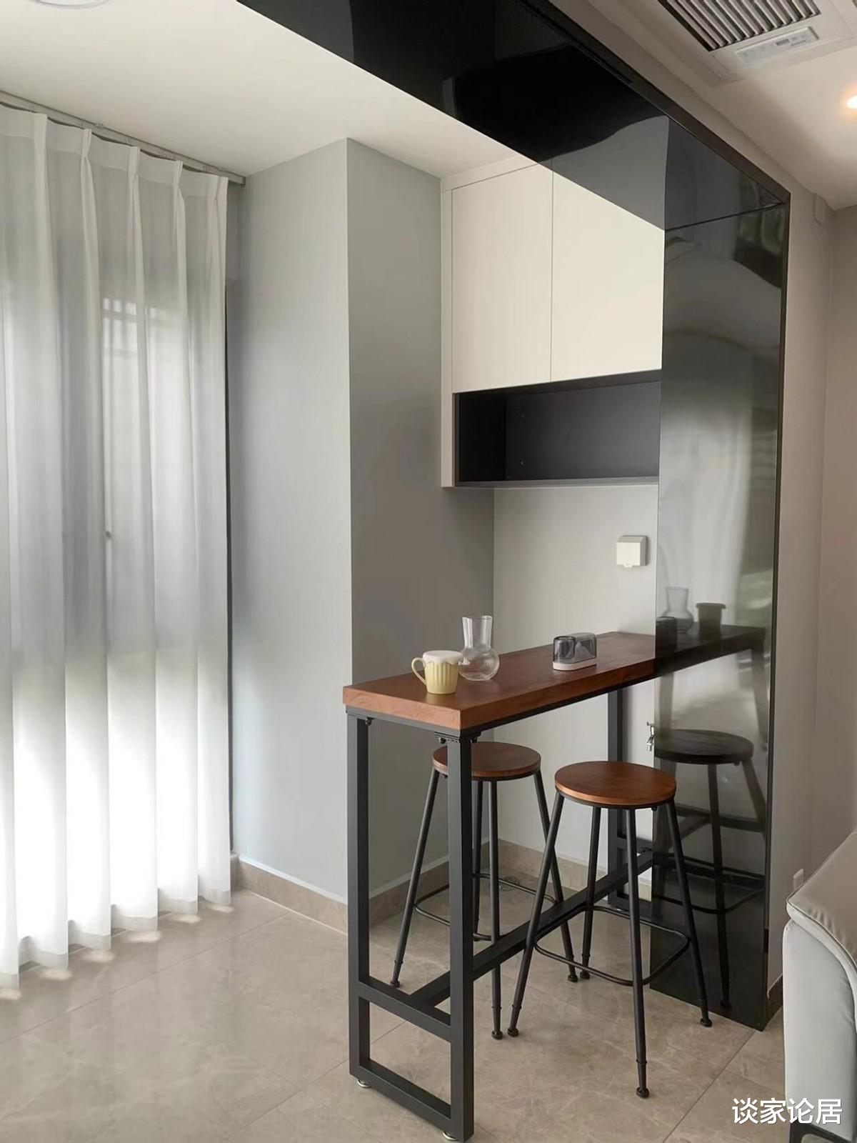 网友@巧克力的阳台封窗了,她没有把吧台靠近栏杆摆放,而是放在原来阳台落地门的位置,这样可以照顾到两个空间,她说,平时还可以坐在吧凳上一边看电视,一边品酒,日子可谓相当惬意!