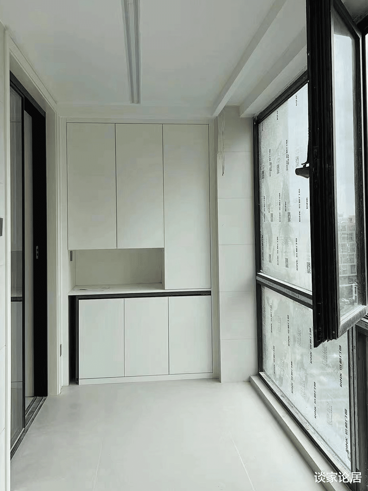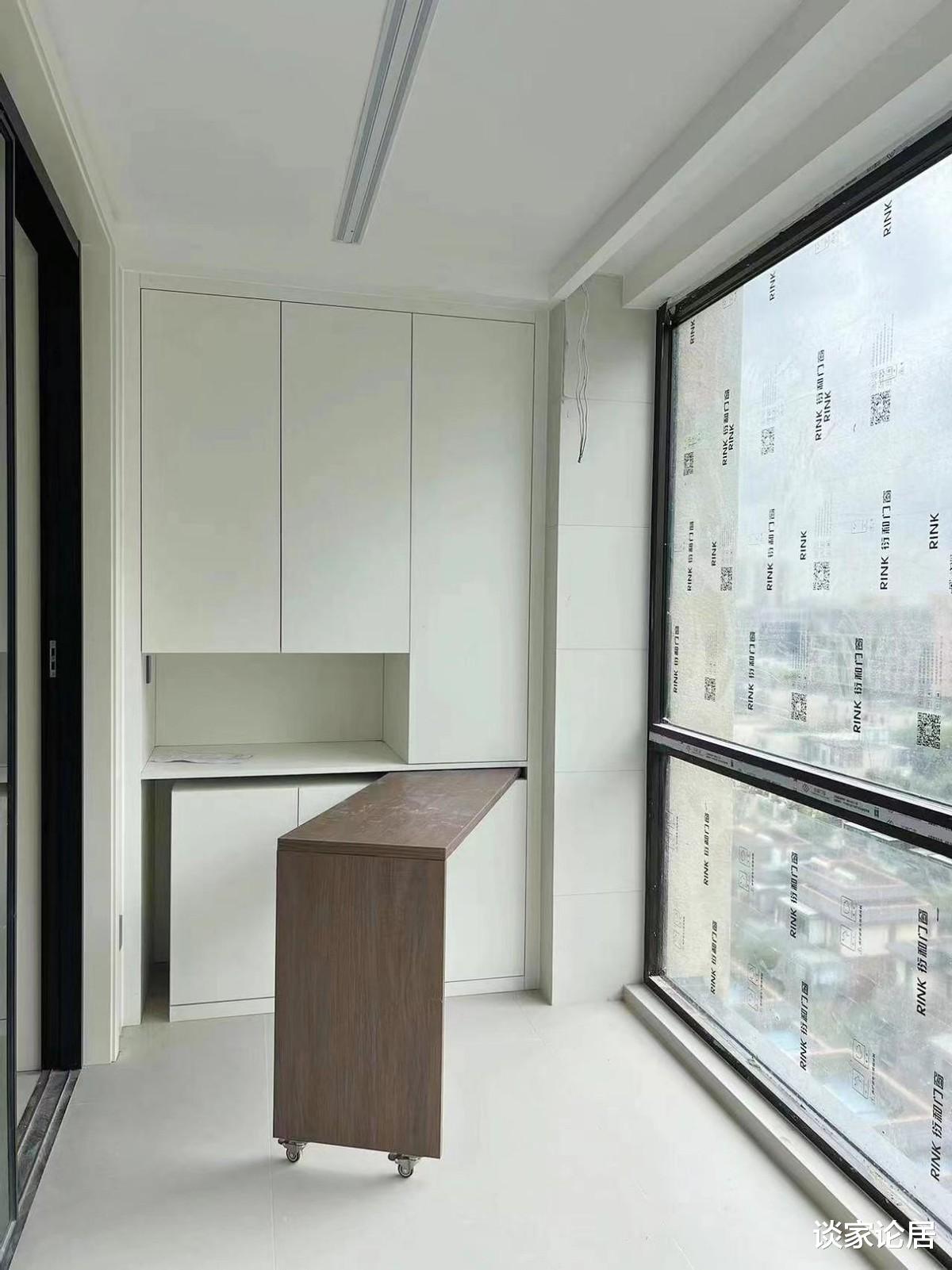 网友@娇娇的家由于没有书房,于是她就在封窗后的阳台做了一张转角的书桌和吧台一体化的定制,靠墙是书桌,上方是书架,靠窗是长条的吧台,一侧固定在书桌上,另一侧直接固定在阳台地面。