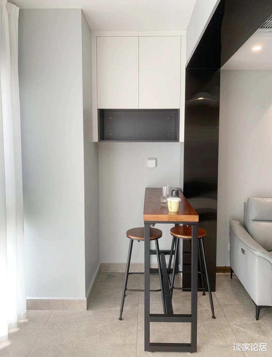 网友@琼飞家的阳台面积不大,如果摆放落地吧台的话,就会影响空间的使用,所以,他就利用栏杆扶手来通过五金件成品的吧台桌面固定,下方悬空,既不占用地面空间,也满足了吧台的功能,相当不错!