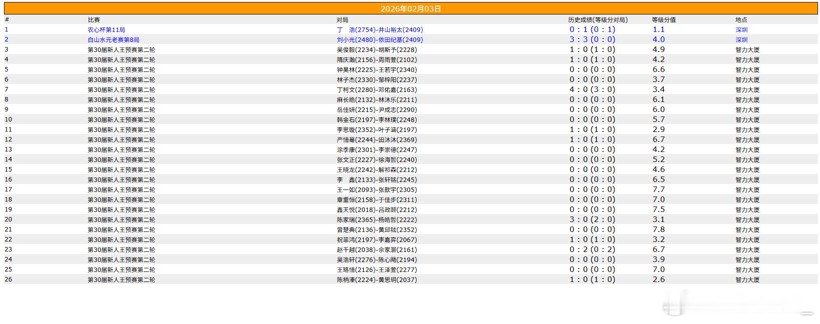 中国围棋职业棋手等级分 2026年1月等级分对局713局陈旭东、雷震坤、董堃复归