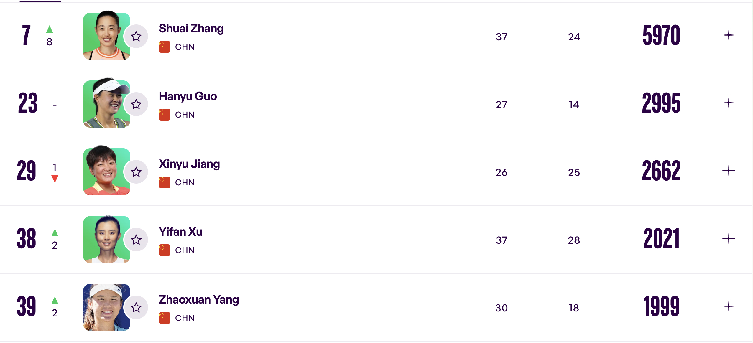 中国球员WTA双打排名更新No.7 张帅No.23 郭涵煜No.29 蒋欣玗No.38 徐一璠No.39 杨钊煊