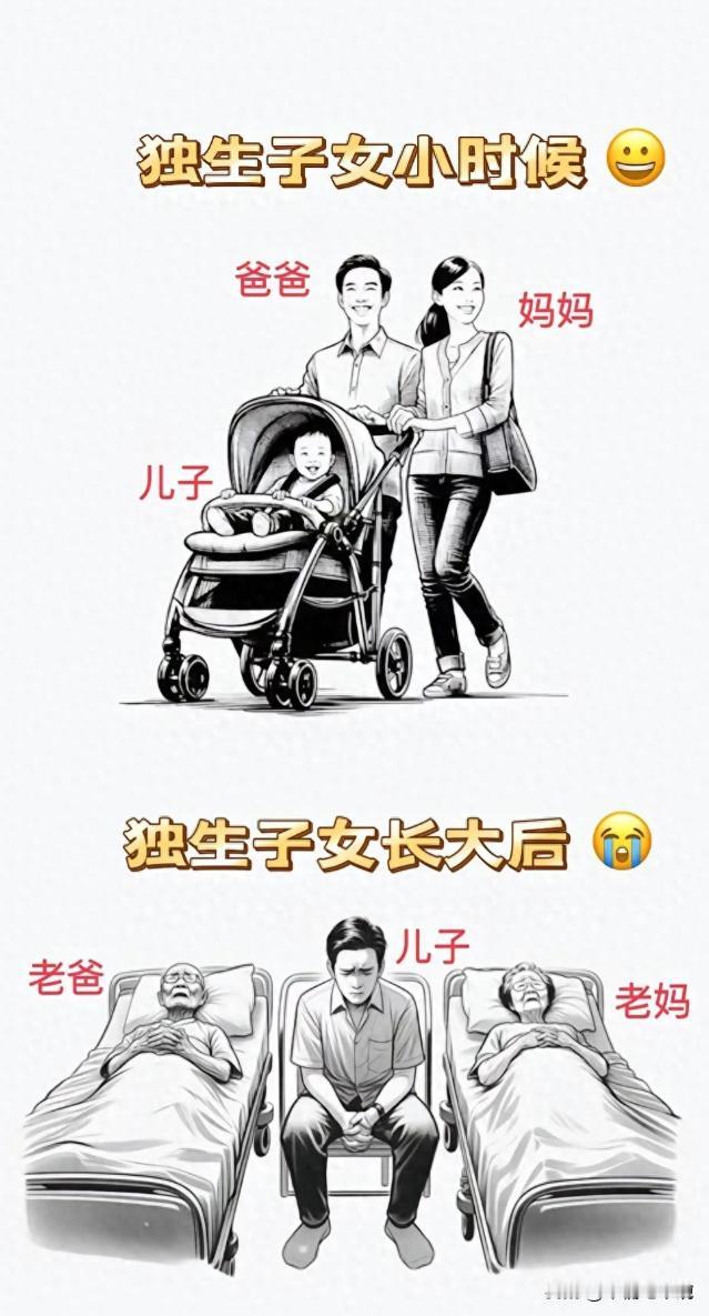 一个非常不好的消息:中国超2亿独生子女面临的非常严峻问题 以前家里兄弟姐妹多,遇事就是“众人拾柴火焰高”,不管是出钱还是出力,大家分摊着,再难也能喘口气;可现在的独生子女,就是家里唯一的“1”,没有分身术,没有避风港,所有的风雨都得自己一个人扛。 说白了,现在中国超2亿独生子女,活得比谁都累,堪称“全方位无死角承压”,以前多子女家庭的避风港,对他们来说就是遥不可及的奢望,所有苦所有难,只能自己咬着牙硬扛。 可能有人会说,独生子女从小独享父母的宠爱和资源,过得多幸福,可这份“独享”,背后藏着的全是长大后的重负,而且这份重负,城乡之间的差距大到离谱,不是所有独生子女的压力都一样。 城市里的独生子女相对还好一些,大多父母有稳定的退休工资,还有医保兜底,晚年基本不用子女过多操心经济问题,顶多就是兼顾一下日常照料和陪伴,就算遇到生病住院,医保能报销一大部分,压力也能减轻不少,不用一个人扛下所有医药费。 可农村的独生子女,才是真的难到骨子里,负担大得让人喘不过气,农村大多老人一辈子靠务农或者打零工谋生,没有稳定工作,自然也就没有退休工资和社保,有的甚至连基本的医保都没交全。 他们辛苦了一辈子,老了干不动活,就彻底没了收入来源,衣食住行、头疼脑热,全得靠独生子女承担。 万一遇到大病住院,动辄几万、几十万的医药费,全得独生子女自己掏,光是这笔钱,就能压垮一个普通的农村家庭,更别说还要兼顾自己的小家庭、孩子的教育开支,一边要养小,一边要养老,那种分身乏术的煎熬,只有他们自己能懂。 更悲催的是,独生子女不仅要扛经济和照料的压力,还要受委屈、被猜忌,干活的时候,所有人都记得你是独生子女,觉得这份责任就该你一个人担。 不管是家里老人的事,还是家族里的琐事,只要需要人出力,第一个想到的就是你,你要是有一点推脱,就会被说不孝顺、没担当。 可一旦涉及到利益,比如老人的一点积蓄、家里的宅基地或者征地补偿款,所有人又都忘了你是独生子女,一个个跳出来争当“继承人”。 你辛辛苦苦干活付出,别人不仅不体谅,还在背后偷偷揣摩,你是不是从中捞到了多少好处,是不是藏了私心,那种出力不讨好的委屈,真的让人寒心。 其实说到底,这些独生子女的困境,不该全由他们自己承担,当年国家提倡计划生育,号召大家“只生一个好”,明确提出独生子女父母由国家养老,很多家庭响应国家号召,只生了一个孩子,为国家的人口政策作出了贡献。 如今这些家庭的父母老了,养老压力却全落到了独生子女一个人身上,显然不太合理。 国家应该出台相应的政策补助,尤其是针对农村独生子女家庭,提高养老补贴标准,完善农村养老保障体系,落实当年的承诺,帮这些独生子女减轻一点负担,不让他们一个人孤立无援地扛下所有。 据说目前已有部分省份推出了独生子女相关的补贴政策,但覆盖范围和补贴金额还不够,很多农村独生子女家庭并没有真正享受到福利。 以上仅为个人看法,不代表任何立场,不知道大家怎么看?你身边有独生子女面临这样的困境吗?欢迎在评论区留下你的观点。