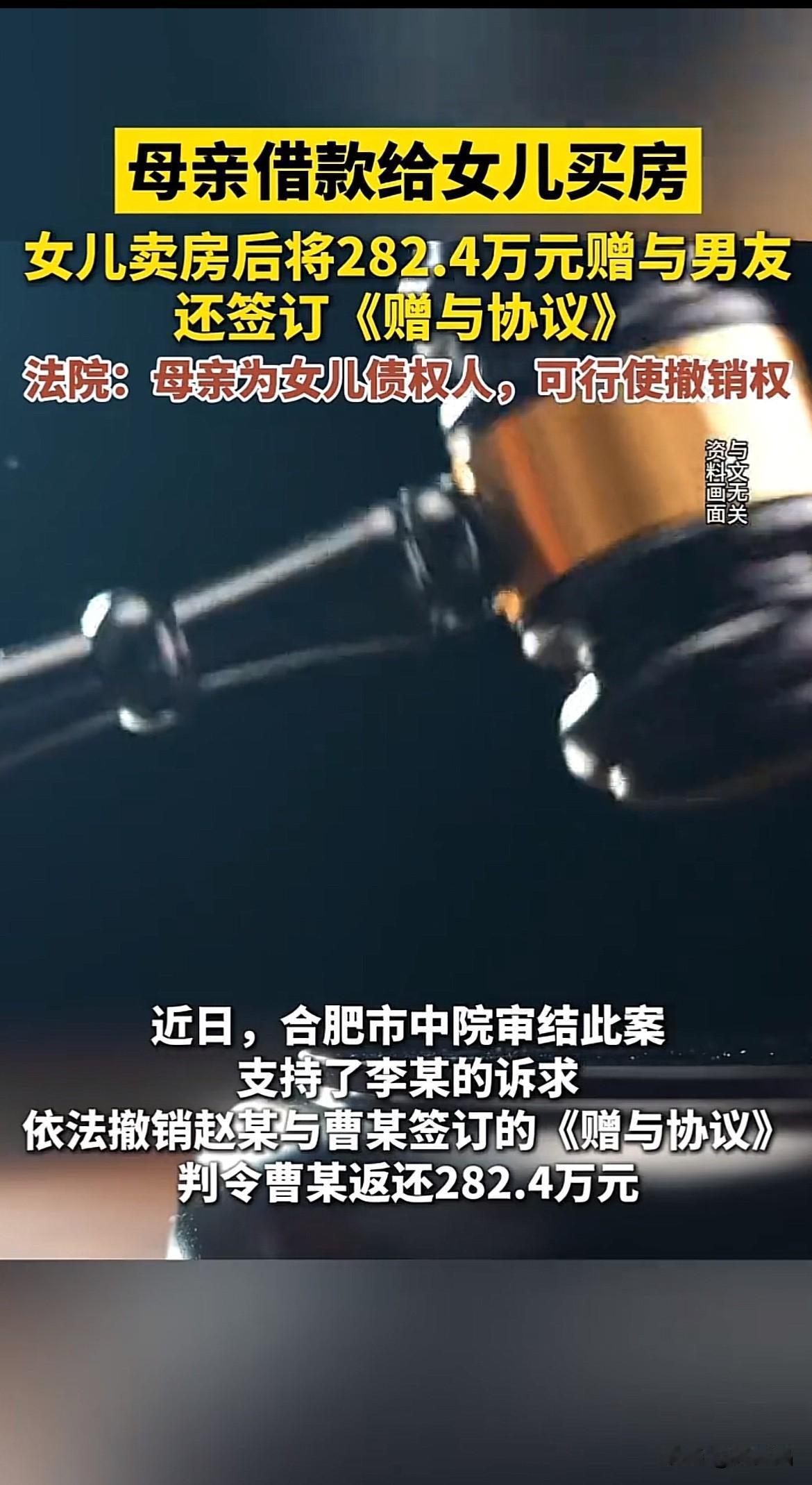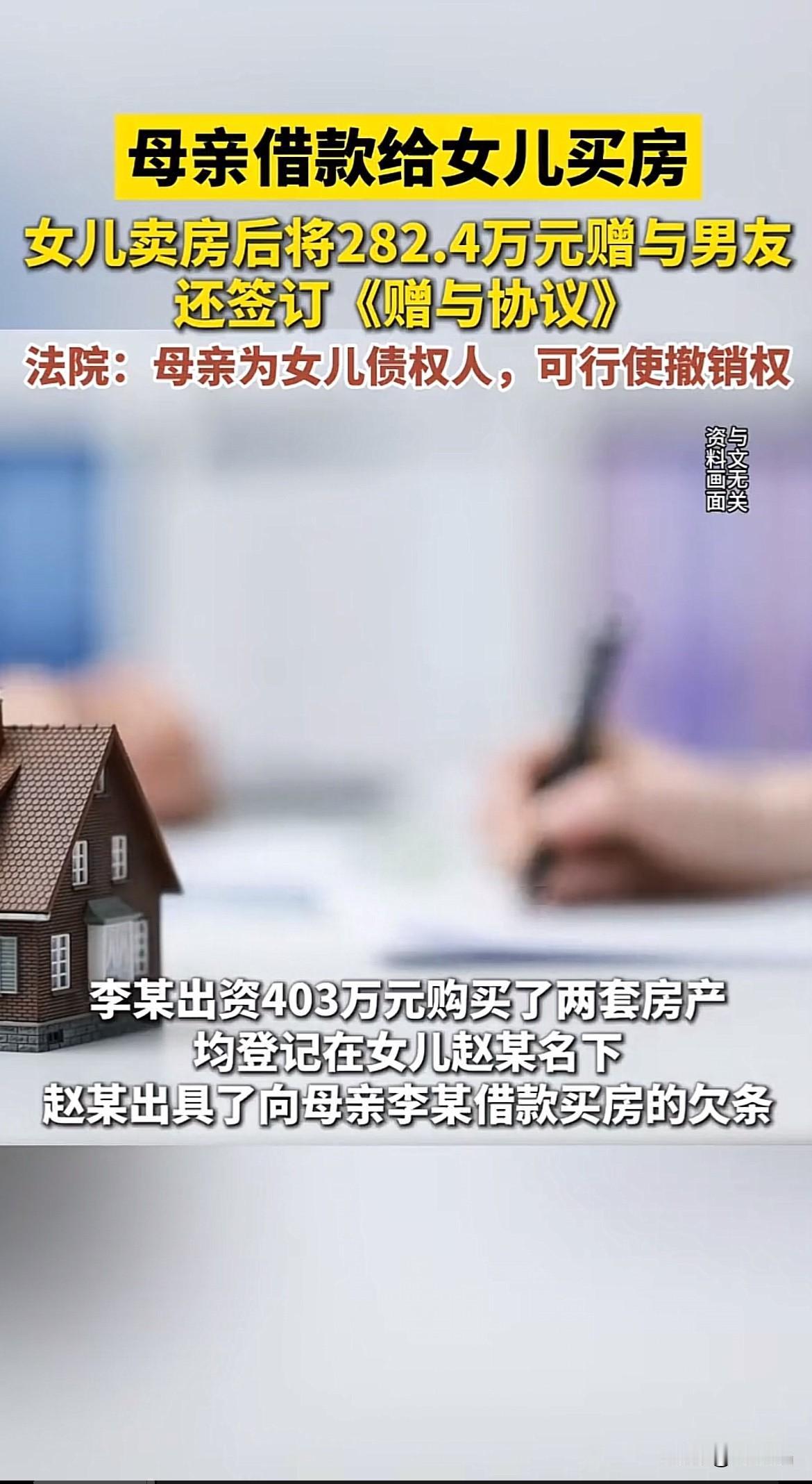 也是没谁了!安徽合肥,一大妈花光积蓄,403万买了两套房登记在女儿名下,没想到女儿转手卖房,把房款282万转给男友,之后两人分手,大妈起诉男友追回钱款,法院判了。 大妈辛苦打拼了一辈子,攒下了一笔积蓄,她就一个女儿,想着给女儿买房,让她以后生活有保障,不会被婆家欺负,于是花403万买下两套房,均登记在女儿名下。 万万没想到,女儿是个恋爱脑,谈了一个男朋友,因为男友创业,女儿想锁住男人的心,把其中一套房卖了,一共卖了313万,可女儿毫不犹豫转给男友282.4万,还签下自愿赠与的《赠与协议》。 之前两人因感情不合分手,大妈得知女儿卖房转钱给男友一事,气得不行,自己辛苦大半辈子打拼下来的钱,被女儿随手就转给别人,大妈气不过,直接到法院起诉追回钱款。 男友刚开始拒不返还,幸亏大妈买房时跟女儿签订了借款协议,说明是大妈借钱给女儿买房的,不是免费赠与,最终法院也因这份借款协议判男友返还282.4万全部赠与。 女儿这恋爱脑也是没谁了!随便就把妈妈买的房子卖掉,还把钱转给男友,丝毫不为妈妈考虑,不念及妈妈的辛苦付出,这女儿也该让她吃点苦头,让她明白钱来之不易,体谅妈妈的不容易。 这事告诫我们,即便是父母给孩子买房,为了保障,还是得把房子登记在自己名下,或者签下借款协议,明确钱是借给孩子买房的,以免自己辛苦赚的养老钱打水漂了。 同时恋爱需谨慎,不要恋爱脑,盲目给对方转钱,多个心眼,不能轻信对方的甜言蜜语,恋爱要保持理性。