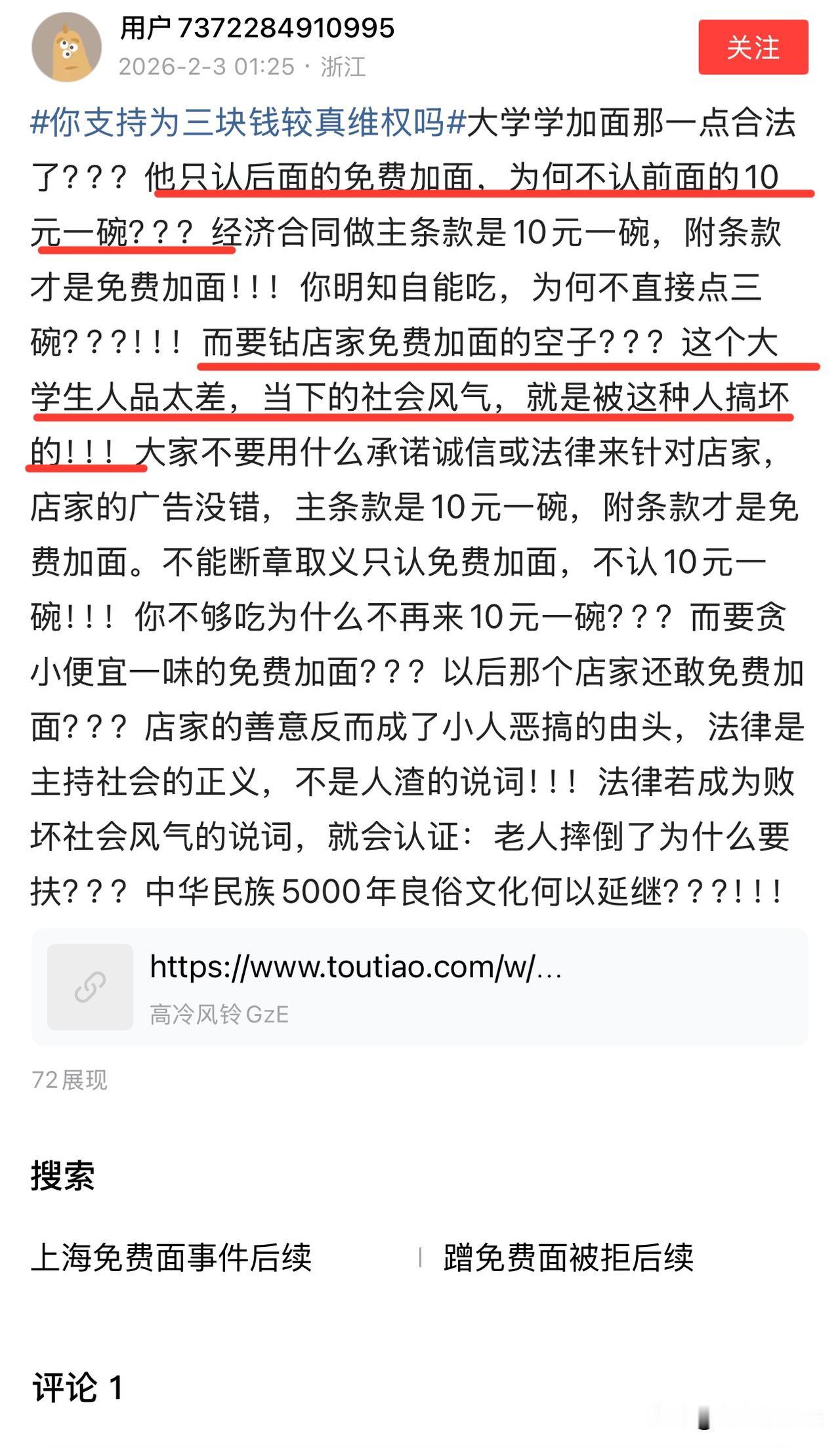 老板,你应该写“不够吃请买两碗,买够了为止” 免费加面,是不是你面馆老板自己写的? 人家顾客没吃饱,按着你店铺的招牌上写的加面何错之有? 你们当地人护着老板而不顾道义还觉得理直气壮? 你们当地的警察置正义不顾,明目张胆的护短,并羞辱外阜顾客,公理何在? 你面馆也不是今天才开张,更不是今天才写的“免费加面”,不就遇到这么一个要加面的顾客吗,害怕赔钱,改了招牌不就行了吗! 你改成“一碗不够请买两碗”,不就万事大吉了嘛。 ——————————