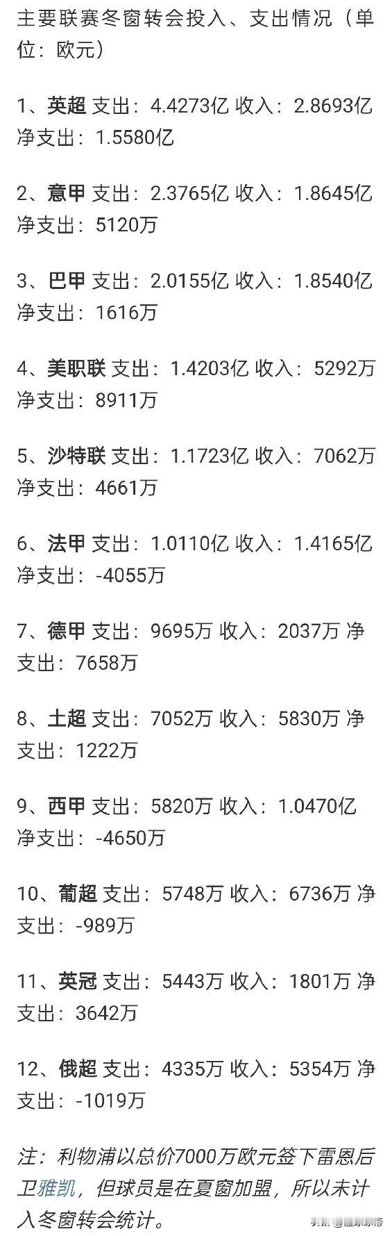 冬窗转会费支出仅有5820万欧元,西甲已经成为了真正的“农民联赛”! 今天欧洲主要联赛冬窗转会都已关窗了,在转会总支出方面,世界第一联赛英超以4.43亿欧元(还不算利物浦7200万欧元签下雅凯)毫无悬念的排名第一遥遥领先,比较意外的是意甲竟然以2.38亿欧元排名第二,意甲难道也要开始复兴了吗? 巴甲以2.03亿欧元排名第三,美职联以1.42亿欧元排名第四,沙特联以1.17亿欧元排名第五,C罗和梅西的影响力太强了,让美职联和沙特联已经堪比五大联赛了。 最让球迷意外的是西甲,竟然仅仅只支出了5820万欧元排名第九,甚至连土超都不如,基本上和英冠做一桌了,变成了真正的“农民联赛了”。巴萨和皇马竟然都没有动作,不知不觉中西甲已经开始没落了,梅罗曾经带来的巅峰已经一去不复返了。