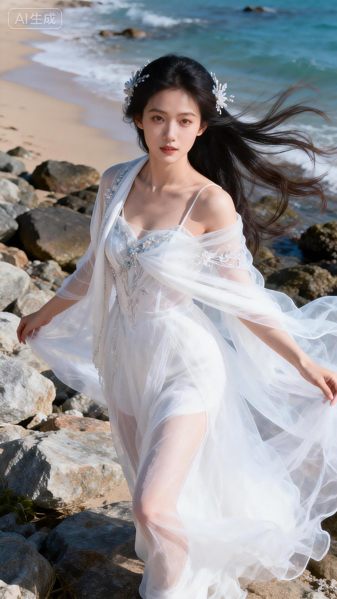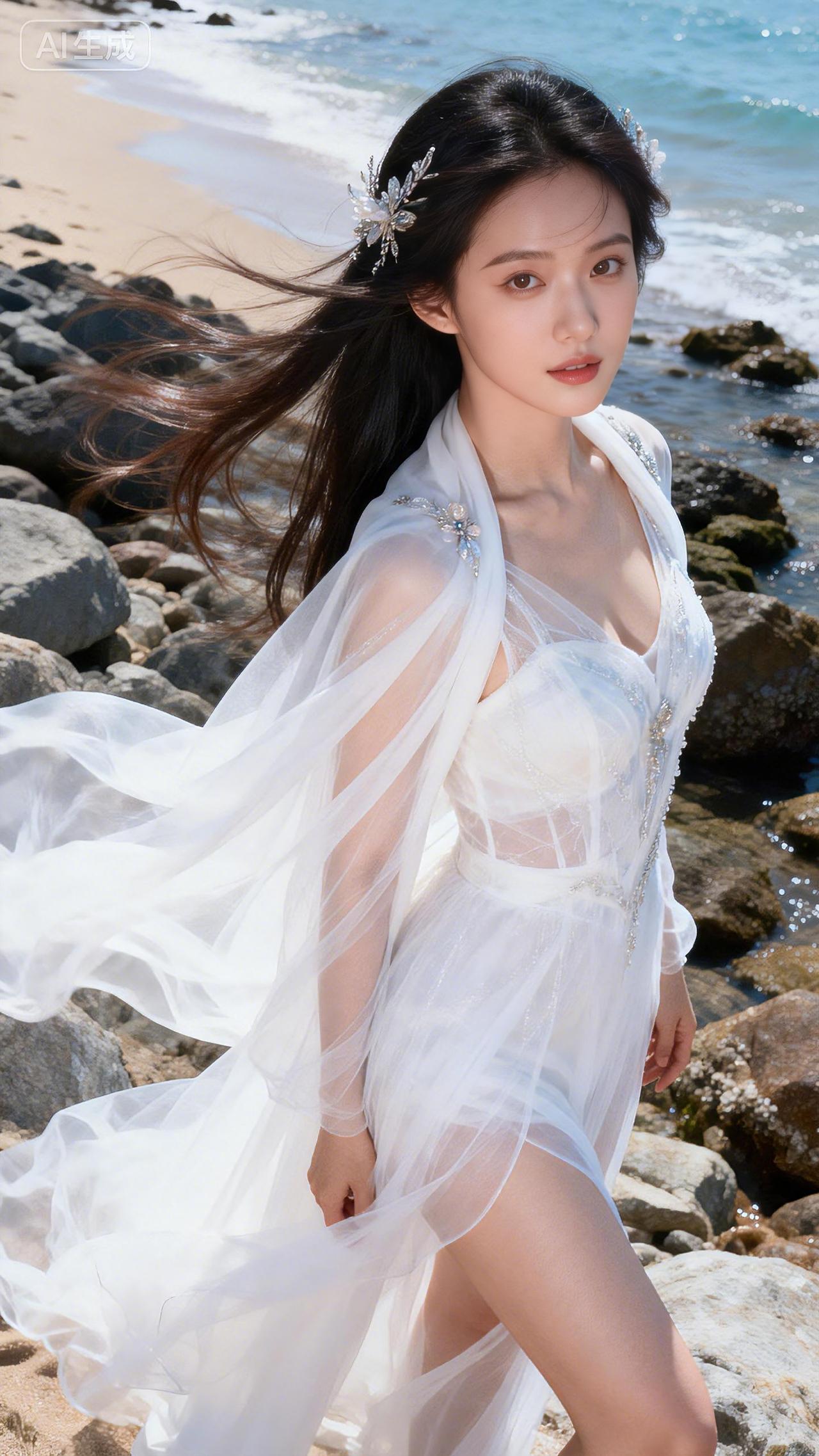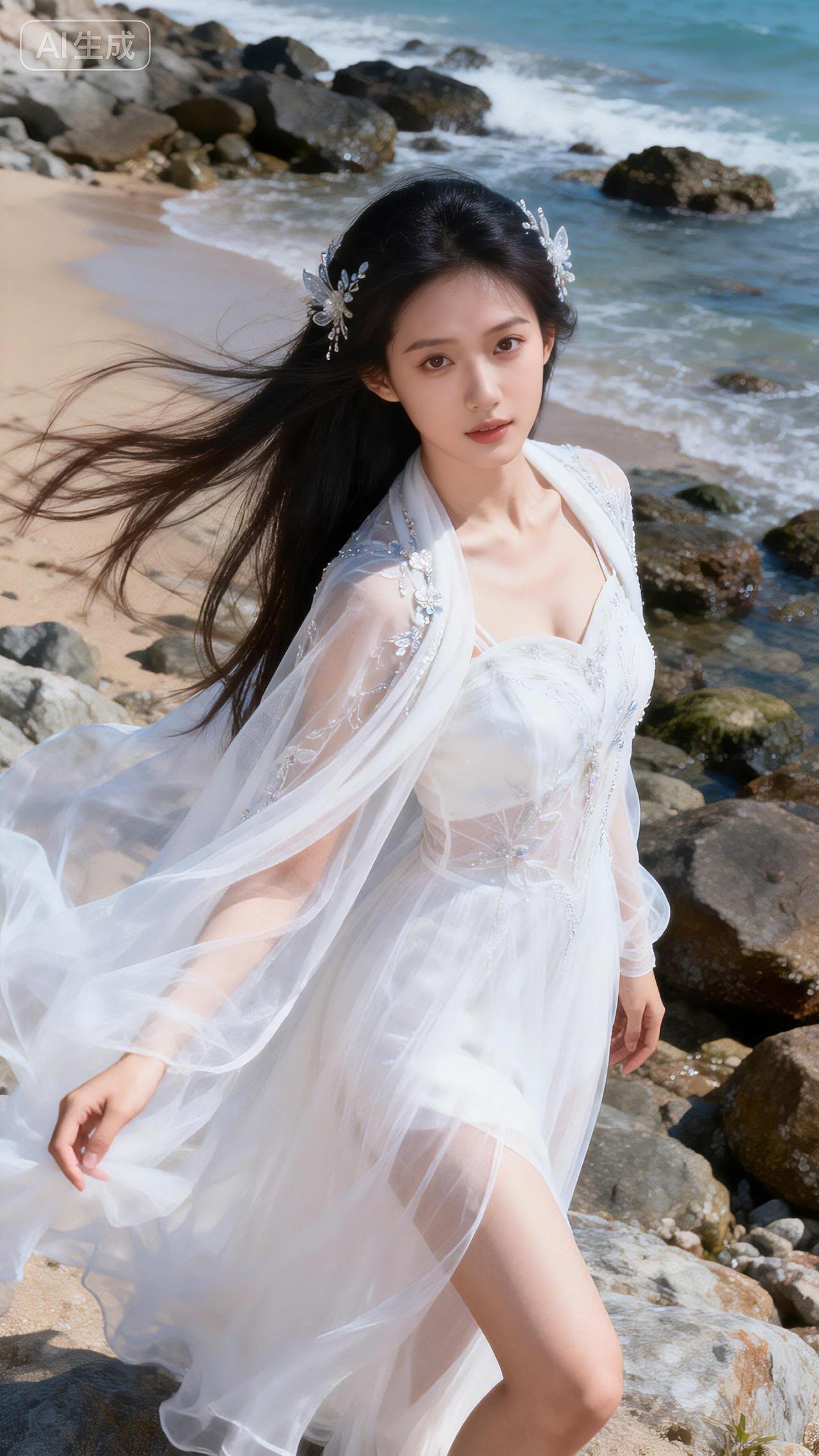 海风吹拂白纱扬,礁石独立水云乡。豆包 壁纸