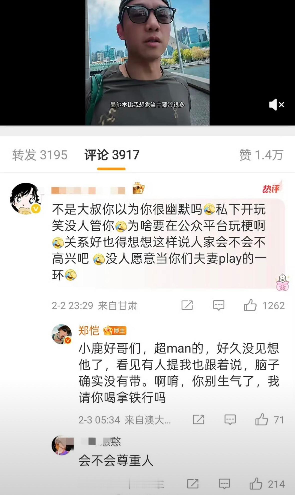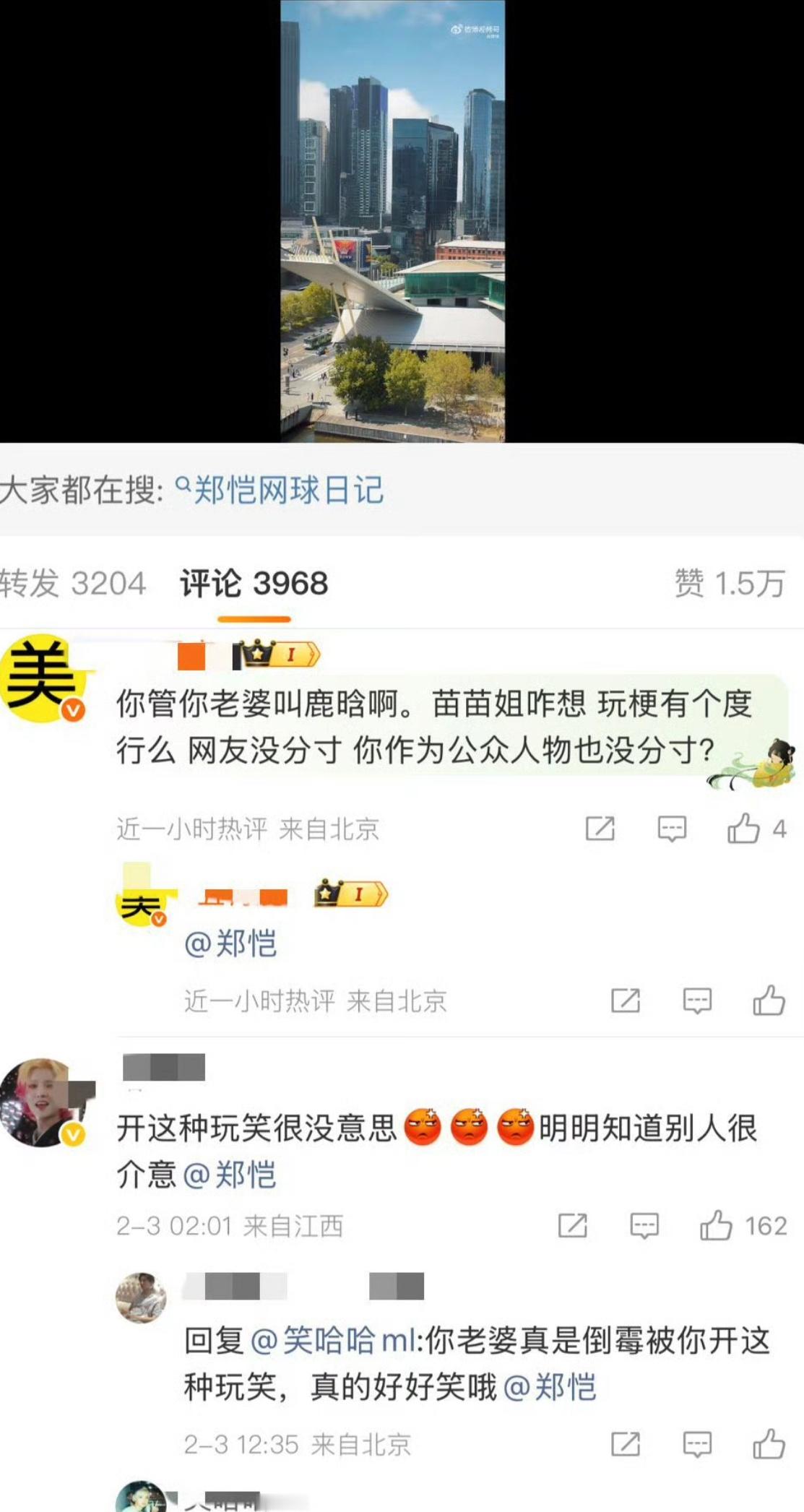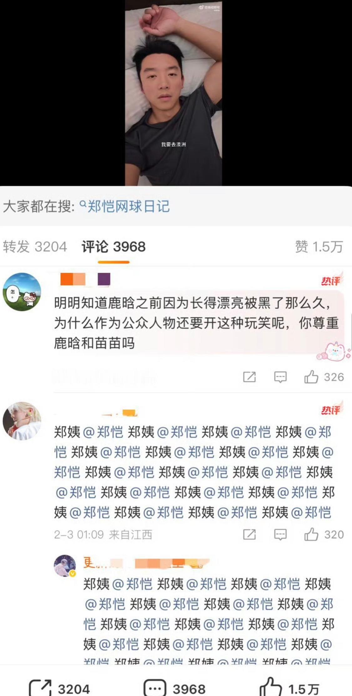 郑恺发了日常视频,里面有个女人,然后有人问那个女人是谁,郑恺说是鹿晗(其实是苗苗)。然后鹿晗粉丝生气了,把郑恺微博给冲了.这不就是玩笑话吗…说真的鹿晗现在也没流量还有舆论,有人提他粉丝应该偷着乐吧结果粉丝还骂人..