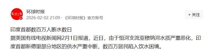 恒河支流变“毒河”?新德里数百万人生死难料,莫迪的大国梦碎了一地   就在全世界都在关注地缘政治博弈的当下,印度首都新德里却悄然爆发了一场惊人的生存危机。   根据美国有线电视新闻网2月1日的一则报道:数百万新德里居民断水数日,正陷在“无水可喝”与“饮用毒水”的绝望死循环里。   作为印度的“圣河”,恒河的重要支流亚穆纳河,如今已经彻底变成了一条流淌着化学废料的“毒河”。   根据最新的消息,因为河水中氨含量严重超标,早已超过了常规水处理厂的极限,新德里全市9座主要水厂中,竟然有6座被迫关停。   我们前面之所以说这是对印度“大国梦”的狠狠打脸,原因就在于这场危机的发生地—新德里。   这里是印度的首都。可是眼下,新德里水务局自己都承认,至少有200万人受到了直接影响。   在西北部的夏尔马区,老百姓的日子简直没法过了。出门就是深及脚踝的污泥,好不容易盼来一点水,流出来的却是黄色的液体,还散发着一股令人作呕的臭鸡蛋味。   这种带有硫化氢气味的水,谁敢喝?可是不喝又能怎么办?对于生活在底层的贫民来说,他们根本没有选择的权利。   富人们或许还能靠购买高价桶装水或者安装昂贵的净水设备来规避风险,但对于像夏尔马区这样的低收入社区居民而言,这就是一道送命题。   要么渴死,要么喝下可能引发霍乱和伤寒的“毒水”。这种社会不公,在这次供水危机中被无限放大了。   更让人感到讽刺的是,官方给出的供水方案简直是在开玩笑。现在的供水频率已经降到了每三天一次,而且即便恢复供水,清洁水的供应时间也只有短短一个小时。   你没听错,三天里只有一小时能接到水。这种极端的资源匮乏,直接将数百万人的生活推向了崩溃的边缘。   这也难怪外界会有声音质疑,连首都的基本民生都保障不了,印度凭什么去争夺联合国常任理事国的席位?   其实,这场危机绝非一日之寒。亚穆纳河的水质恶化问题,早就不是什么新闻了。长期以来,工业废水和生活污水毫无节制地排入河中,政府对此却总是睁一只眼闭一只眼。   这次氨含量急剧升高,不过是长期环境欠债的一次集中爆发。说白了,这就是典型的“先污染后治理”思维带来的恶果,只顾着经济指标的狂飙突进,却彻底忽视了城市承载力和环境保护。   而且,印度政府现在的反应速度,也实在让人不敢恭维。面对如此严重的公共卫生危机,官方除了两手一摊表示“无法处理”之外,似乎并没有拿出什么解决办法。   这种行政效率的低下,只会激起民意。如果官方继续这样慢吞吞地应对,恐怕接下来引发的就不只是公共卫生问题,可能是社会动荡了。   站在国际观察者的角度来看,新德里的这场水危机,给所有发展中国家都敲响了警钟。城市治理能力如果跟不上人口增长和工业化的速度,所谓的繁荣不过是建立在沙滩上的城堡。   对于莫迪政府来说,现在的处境完全可以用“内忧外患”来形容。如果不尽快解决首都的喝水问题,平息民众的怒火,那么这场危机很可能会成为压垮骆驼的最后一根稻草,让印度在国际舞台上的形象彻底崩塌。   如今新德里的局面依然停留在混乱之中,数百万双眼睛正盯着政府的一举一动。接下来如何从根本上治理亚穆纳河,如何重建脆弱的供水体系,就要看印度政府决心了。   至于这场危机何时才能真正画上句号,恐怕谁也不知道。