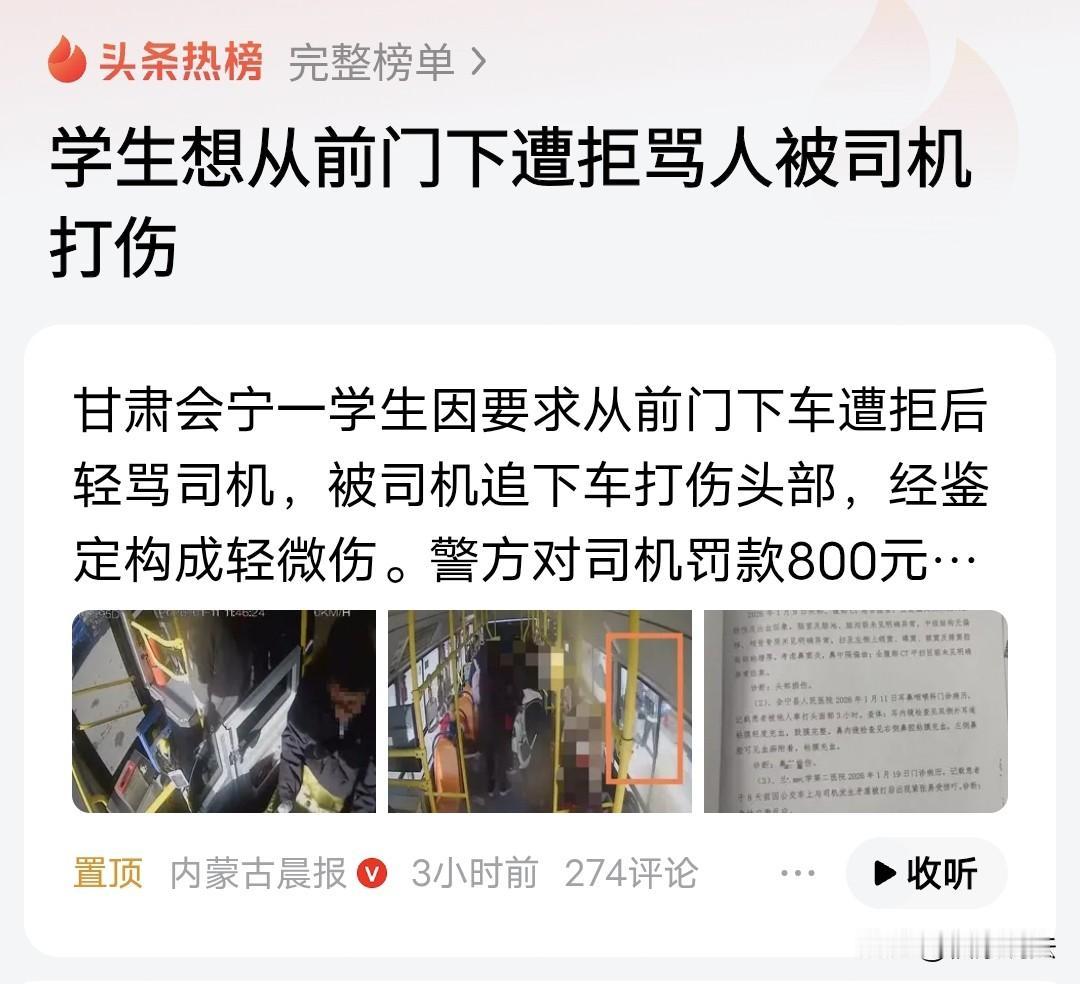 甘肃,16岁学生坐公交车,3次和司机说,想从前门下车,司机在第3次才回应:后门不能下吗?学生骂了一句脏话才下了车。这下惹毛司机,他怒气冲冲追下车,照着学生头部打了一下,结果,学生受了伤,其父亲报了警,司机被行政处罚800元,学生没罚,可学生家长欲索赔,公交公司回应:若再不依不饶,或追究孩子责任。 2026年1月11日,11点40多,一9路公交车上,有十几个乘客,气氛原本风平浪静。 16岁的学生小户上车后,坐在紧邻司机座位的前门处。 车辆行驶一处公交站时,小户想从前门下车,便来到司机座位旁,三次请求司机打开前门让他下车。 可小户说了两次,司机只顾开车也不吱声,直到小户问了第三次,他才反问:“后门不能下吗?” 小户见司机拒绝,心中虽有些不快,但还是转身走向后门,低声嘟囔了一句脏话后正常下车。 可这句轻如蚊蚋的骂声,却如火星溅入干柴堆,瞬间点燃了司机的怒火。 司机罗某某,这位42岁的中年男子,迅速解开安全带,打开驾驶位旁的防护栏,怒气冲冲地从前门冲下车。 他带着怒火几步就追上小户,一把将其向后推搡,紧接着右手猛地朝小户头部挥了一下。 好在现场路人眼疾手快,及时上前劝阻,司机这才罢手,返回驾驶位。 整个过程如疾风骤雨,尚不足一分钟。 小户告诉了父亲,父亲立刻报警,并在三小时后带小户去了医院。 据门诊病历显示,小户鼻部挫伤、双侧外耳道粘膜轻度充血。 八天后,小户又在另一家大医院的诊证明书证明,小户出现“急性应激反应”“极重度焦虑症状”。 另外,经鉴定,小户已构成轻微伤。 司机一开始就应该和小户解释清楚,为什么不能从前门下车?也许就不会发生这件事了。 小户虽轻声骂了一句脏话,这行为确实不文明,孩子一时冲动、口无遮拦,也有错处。 而且,小户之前三次请求从前门下车,或许只是习惯了以往司机在人多时的做法,这样他下车方便,也不是完全无理取闹。 而司机作为成年人,本应有着更强的情绪控制能力和更成熟的处事方式。在被学生辱骂后,他不仅没有保持冷静,反而冲动行事。 为此,司机也付出了代价。 依据2026年1月1日起施行的《治安管理处罚法》第51条,殴打他人或故意伤害身体的,根据情节轻重处以拘留及罚款。 本案,司机罗某某虽受学生言语挑衅在先,但其下车拉拽、殴打未成年人导致轻微伤,法律属性已从“口角”升级为“违法伤害”。 警方对司机罗某某处以行政处罚,罚款800元。 对学生小户不予处罚。 但这件事并未就此结束,据公交公司工作人员表示,小户家长曾跟他们提出索赔要求,还有精神抚慰金,但双方没有谈妥。 而且,这位工作人员还说,如果家长在不依不饶,公司或追究小户的相应责任。毕竟,小户也骂人了,也违反《治安管理处罚法》的相关规定。 另外,工作人员还说,司机打学生,是他个人冲动行为,和公司没有直接关联,公司也会依法划分责任对此处置。 这件事的焦点在于,到底是司机的错,还是学生的错? 有人说,虽然学生骂人不对,但是作为服务工作的司机打人更不对。作为司机情绪极为不稳定,对顾客和路人会有一定的安全隐患,这次途中放下一车子人就追这个骂他的人打,以后没准儿就更能为了自己的不痛快而不顾全车人的安危。只能说,这个思想的司机不适合做为人民服务的公交车司机。 也有人说,16岁的孩子了,不算小了,对公交车前门上,后门下,这点常识还得重新学习一下吗?即使之前这么走过也不代表是对的,就图自己方便就不遵守规则还骂人,也有错,是该受点教训。 其实,这件事,司机和学生都有错。 先说学生小户,他三次要求从前门下车,前两次司机没回应,第三次司机反问后,他这次没被允许,心里可能有点气,但骂人这种行为肯定是不对的,在公共场合得注意自己的言行,尊重别人,这是基本的素质和教养。 而司机作为成年人,本应有着更强的情绪控制能力和更成熟的处事方式。 可司机罗某某作为一名握着方向盘、服务公众的职业人员,职业操守和法律底线应该是刻在骨子里的。 被骂一句就熄火下车,追着孩子动武,这性质就全变了。 司机此举严重违背了基本的道德准则和服务行业的职业操守,在情理上实在难以被原谅。 他本可以口头教育,或者报警等合理方式解决问题,偏偏选择了最错误的方式,实在是糊涂至极。 这事也提醒大家,遇到冲突都能多些理智,少些冲动,遇到问题好好说话,能减少80%的矛盾。 对此你怎么看呢?