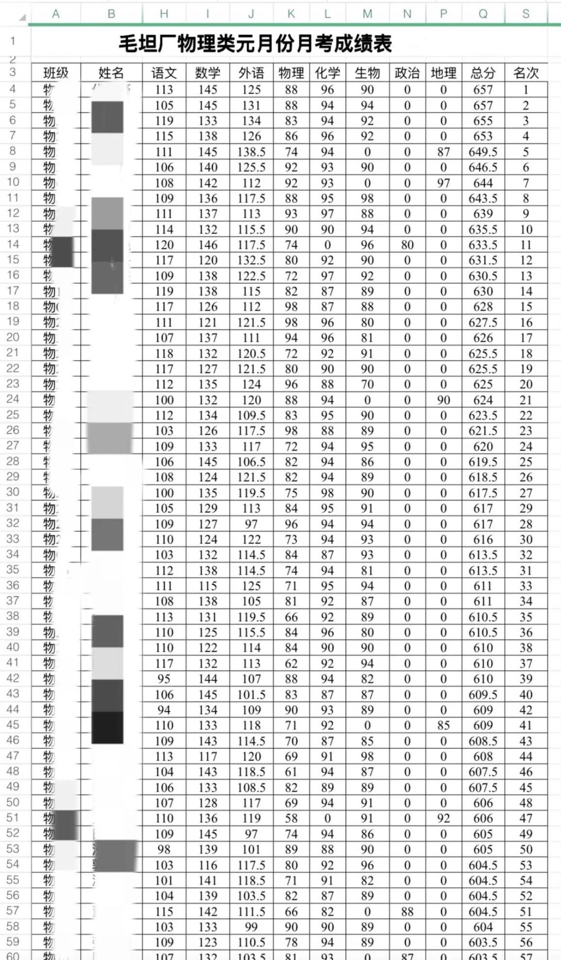 不愧高考届中的加工厂,毛坦厂高三2026年元月份物理类测试成绩年级前57名均在600分以上,年级第一名657分2人,理综成绩274和276,数学145分,第二位潜力比第一位较大,语文拉第一位8分,下次极大可能会赶超第一位同学。 毛坦厂高中成绩确实很优秀,10分一区间内分数悬殊不大竞争激烈,部分同学选择了放弃化学和生物选择了地理和政治,对于一些物化生组合专业600➕的分数不能填报有点可惜。毛坦厂高三2026年元月份考试成绩