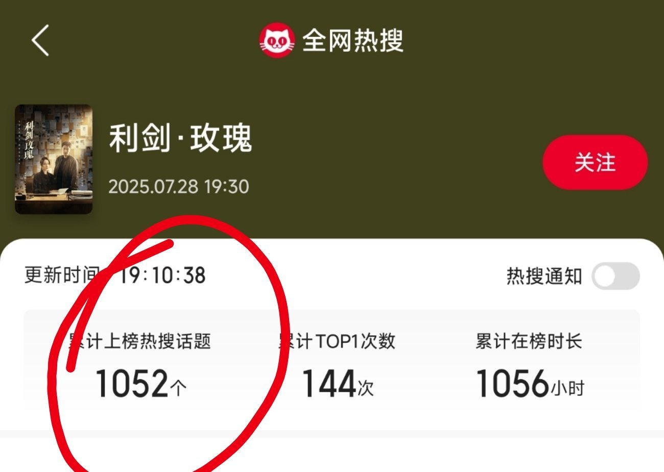 热巴主演的《利剑玫瑰》,过去半年了,热搜词条才1052个,完全是压热度的情况下取得🉐好成绩。(优秀全靠同行衬托系列!)