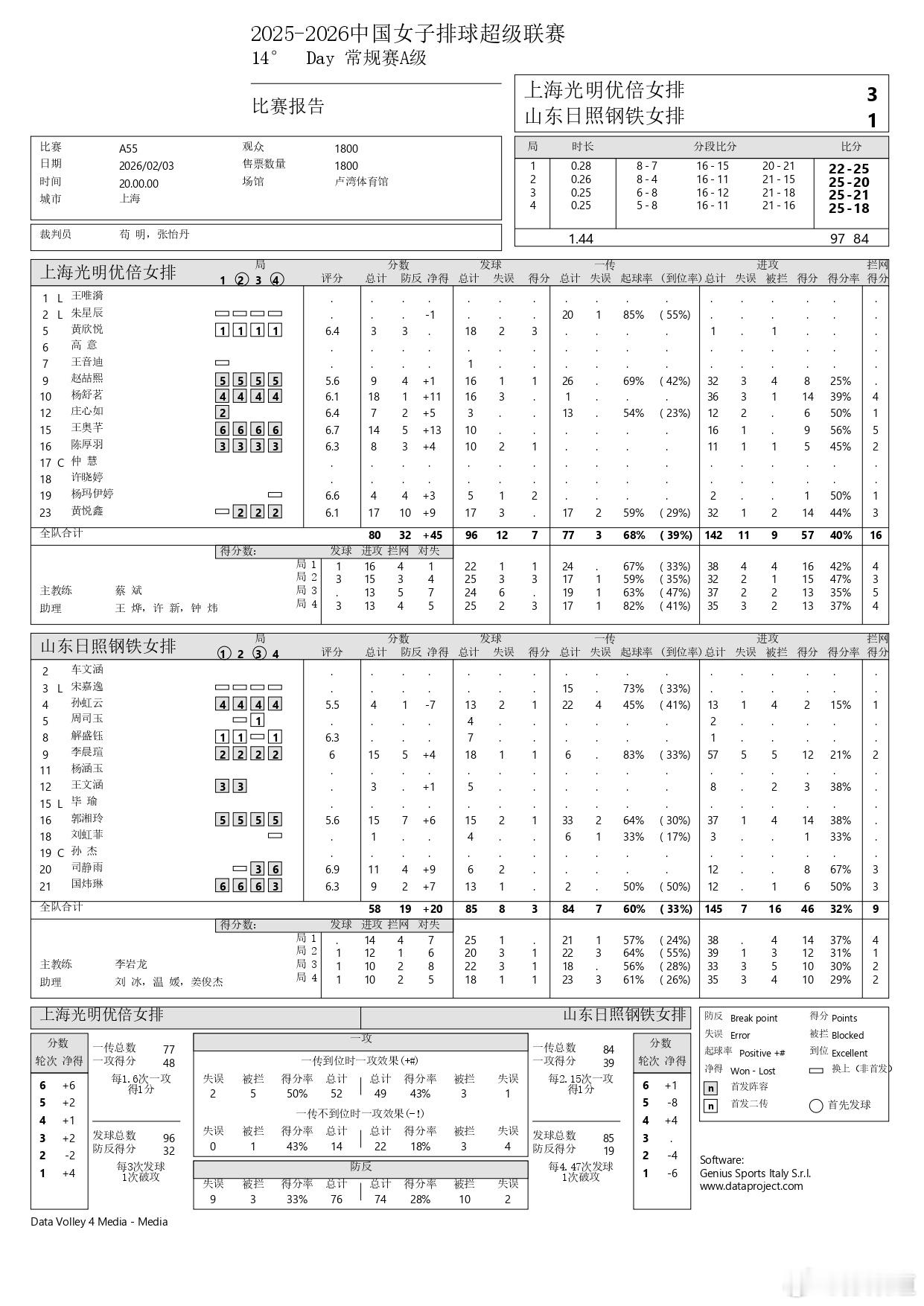 2025-2026中国女排超级联赛排超联赛上海女排3-1(22-25/25-20/25-21/25-18)山东女排 ,看看李晨瑄和黄悦鑫的数据……