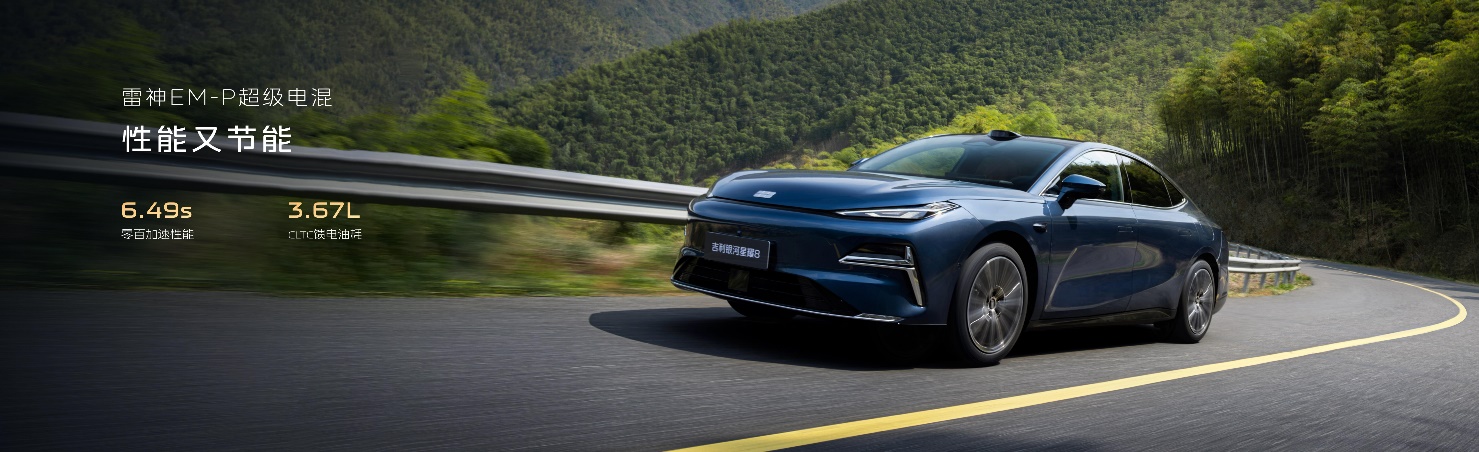 吉利银河星耀8是搭载雷神超级电混双动力的车型,用户既可以选择节能又性能的雷神EM-P超级电混,也可以选择极致节能、超长续航的雷神EM-i超级电混。搭载雷神EM-i超级电混的吉利银河星耀8,搭载热效率46.5%的1.5L混动专用发动机与E-DHT 11合1电混专用电驱,馈电油耗仅为3.36L(CLTC工况);搭载雷神EM-P超级电混的版型,则拥有6.49s的零百性能表现,百公里馈电油耗仅为3.67L(CLTC工况)。结合星睿AI云动力,吉利银河星耀8打破既有电混轿车性能与油耗不可兼得的桎梏。