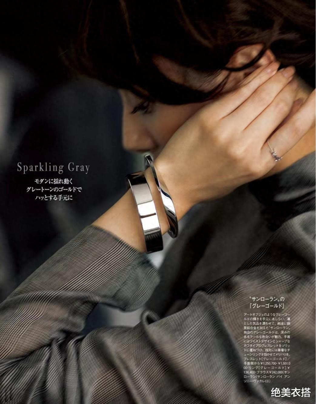 其实,于普通里觅精彩,一对流畅线条的银色大量感手镯,足够了。取之于灰色,与灰色意象不谋而合,却能因金属质地,让人一眼入心。