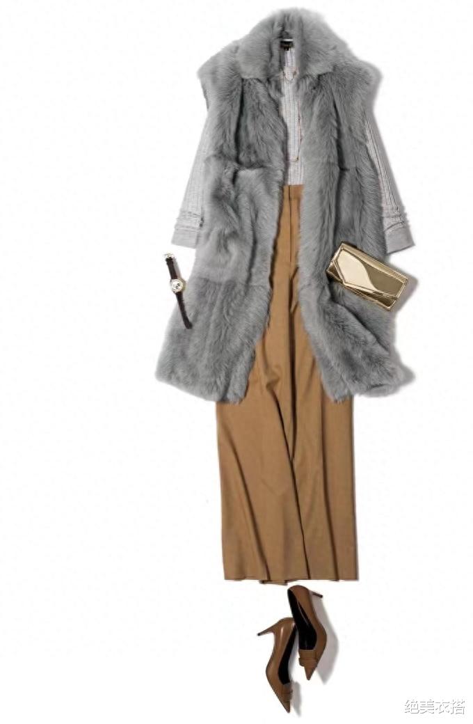 厚厚的灰色皮毛长马甲,少了袖子,穿搭的灵动性极高。而与棕色裤子配合,则让它的高级感成倍叠加。