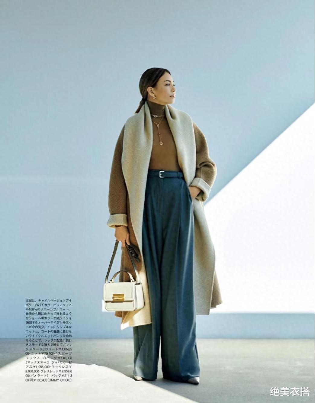 内搭浅米衔接,包包、围巾呼应,金饰强化,造型力超级出彩。