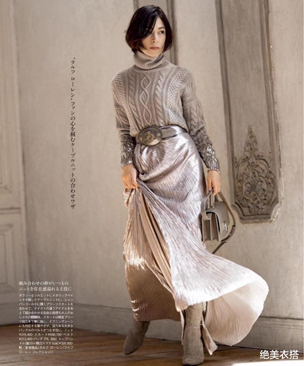 如下图半裙,细腻亮片,光泽质感,blingbling,犹如一道光的米色,与卡其长风衣配合,无论配色,还是风格,都做到了极致化呈现。