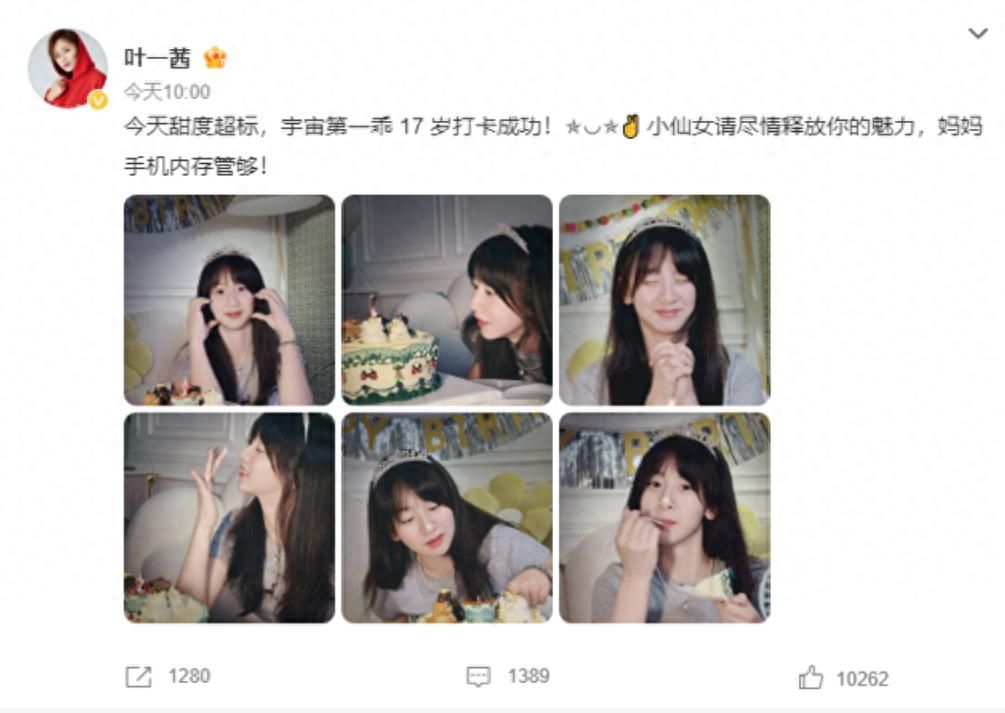 叶一茜在文案中写道:“今天甜度超标,宇宙第一乖17岁打卡成功,小仙女请尽情释放你的魅力,妈妈手机内存管够!”