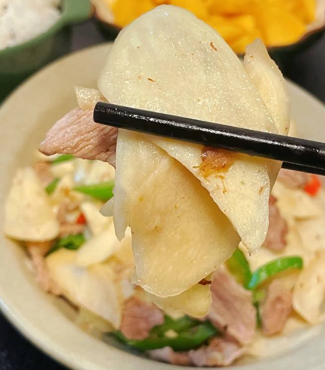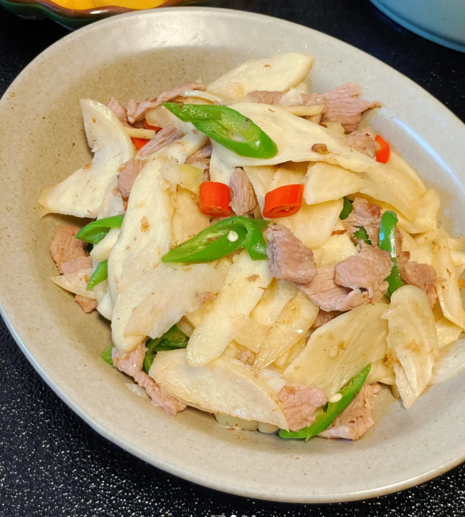 辣椒茭白炒肉片是一道春季的时令菜肴,菜肴端上桌就被抢光,茭白是春季鲜嫩的蔬菜,色泽洁白,搭配猪肉是绝配,青红辣椒的加入,让菜肴色泽更诱人,口感清爽基尼,肉片嫩滑不柴,每一口都是享受。