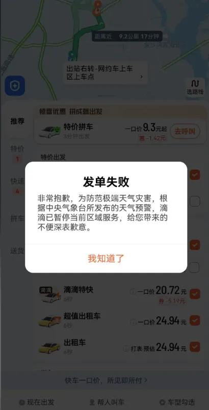 据车友爆料,许多乘客在使用叫车软件时,已经提示:非常抱歉,为防范极端天气灾害,已经暂停服务了。