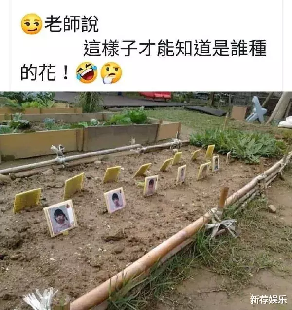 老师让孩子们在自己种的植物旁边放上自己的大头照,这样容易认得出长发后的植物哪棵是自己的,但是这样看好像有点不吉利的感觉?