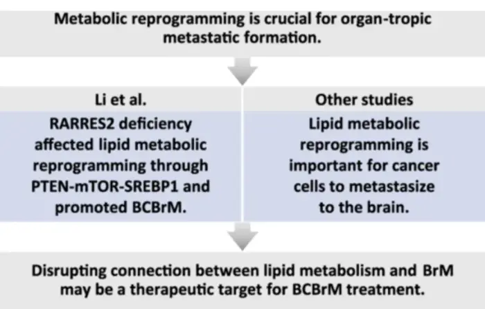 The brain is a common metastatic site for carcinoma, and metabolic reprogramming is crucial for organ-tropic metastatic formation. Li et al. found RARRES2 deficiency affected lipid metabolic reprogramming through PTEN-mTOR-SREBP1 pathway and promoted BCBrM. Other studies revealed that lipid metabolic reprogramming is part of metabolic adaptation to central nervous system. Overall, there is an intricate connection between lipid metabolism and brain metastases, and disrupting this connection may be a potential therapeutic target for BCBrM treatment.