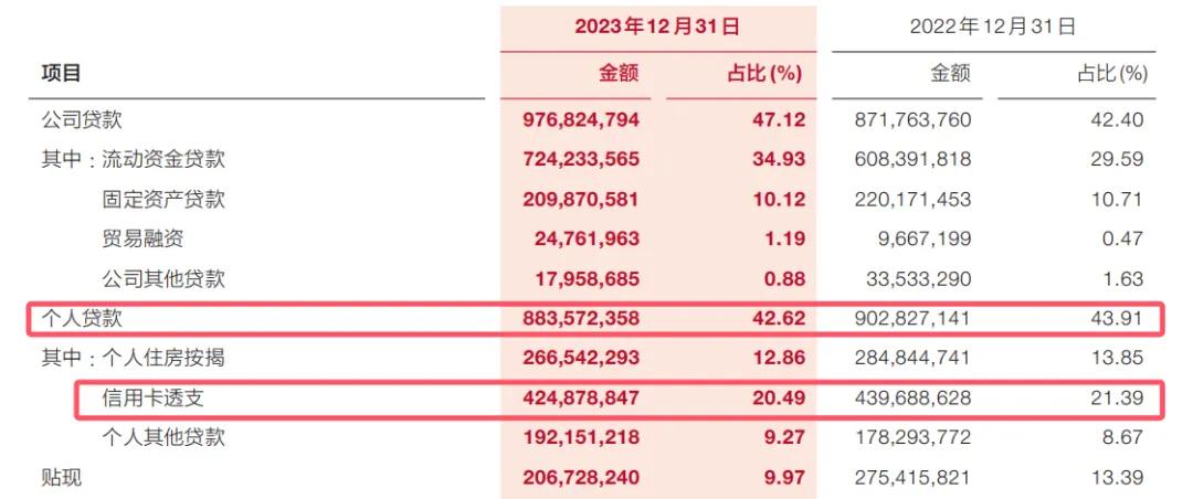 目前尚未看到露信用卡业务具体数据,根据该行2023年年报,截至2023年末,信用卡透支余额为4248.78亿元,同比2022年末下降3.37%,占个人贷款的比例为48.09%,贡献了近一半的个人贷款规模。
