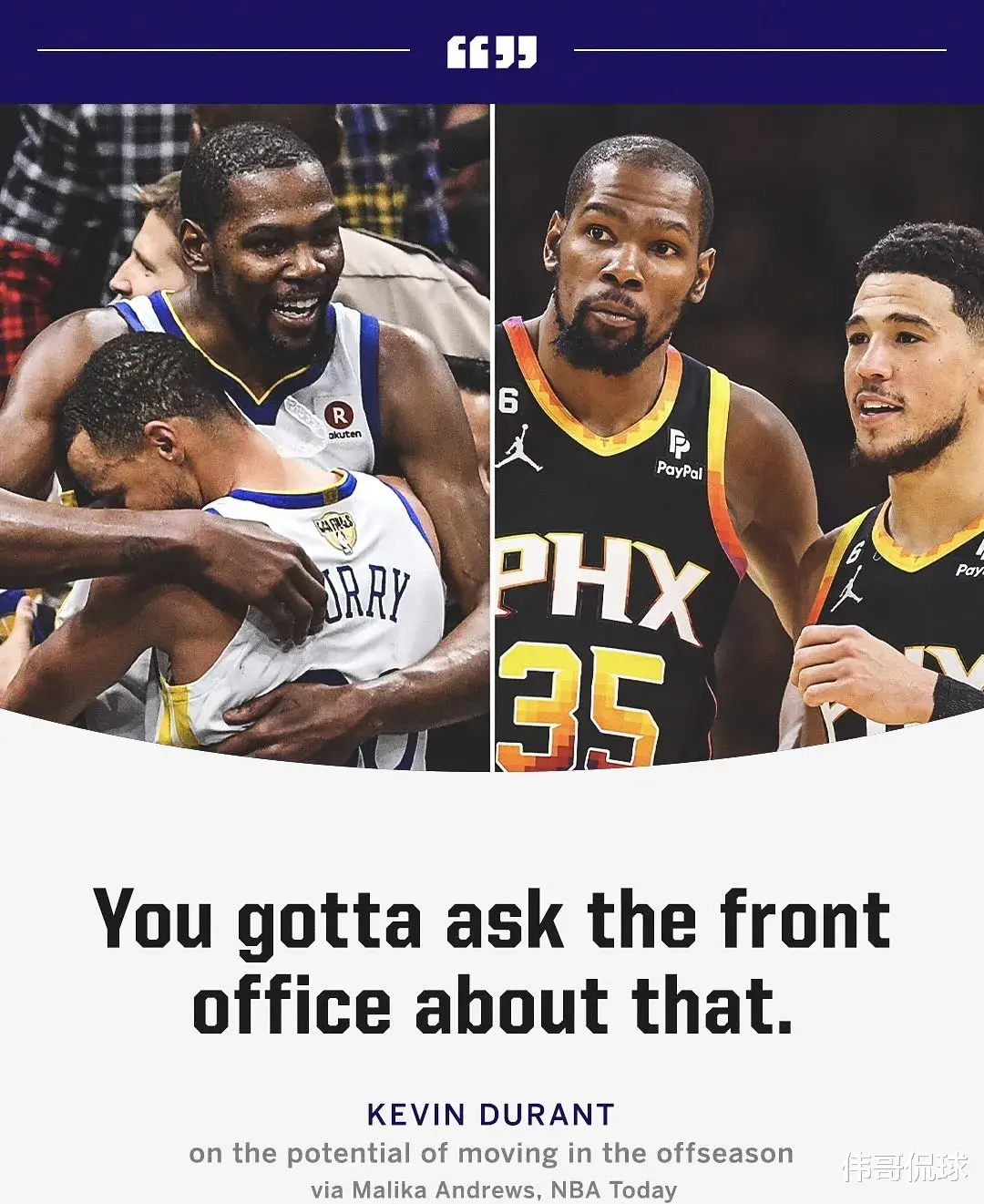最后是杜兰特再谈交易动向,杜库还有重组可能?杜兰特接受专访时谈夏天未来时表示,这你得问管理层去。值得强调的是,ESPN官方晒出采访并写道:“尽管杜兰特表示他不想要在赛季中被交易,但是阿杜并没有排除未来和勇士重聚的可能。”杜库个人感情肯定没问题,当年天下无敌的库杜挡拆和总决赛阿杜硬喂库里MVP的画面历历在目,最大的问题是阿杜被四人招募,降薪续约,甚至付出一条跟腱,却没有换来管理层最大的诚意(格林问题),这个坎儿很难过去。真勇士球迷应该不会诋毁阿杜,不管阿杜去哪都祝福。时也命也,本来去篮网会有大好前程,无奈不是这个伤就是那个伤。在太阳真的是白瞎了,光得分没防守的球队注定走不远。希望阿杜保持健康,多打一场是一场,像他这样的历史级得分手,未来NBA恐怕很难再出现了,大家且看且珍惜吧。球迷们,你们认为今年哪支球队会赢得总冠军?欢迎大家在评论区交流讨论。