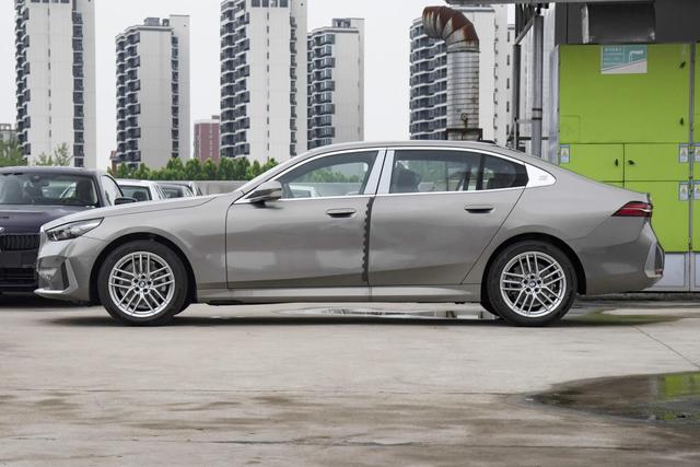 来到侧面,宝马5系是经典后驱车的设计,由于动力总成采用纵置的布局,所以它的车头距离驾驶座较远,看起来具有不错的力量感,而车顶的线条是比较平直的设计,后车门较大,符合行政级轿车的表现。