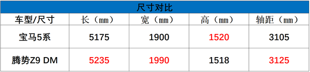 尺寸方面,腾势Z9 DM的长宽高分别为5235/1990/1518mm,轴距3125mm,要比加长而来的宝马5系还要大一点,但总体两车给人的体量感差不多。