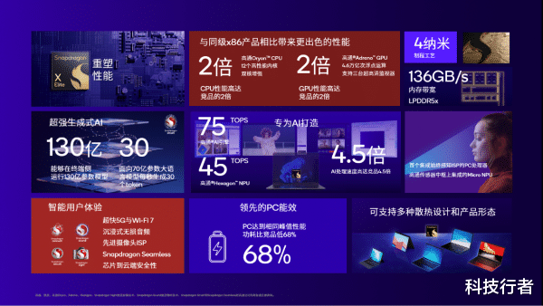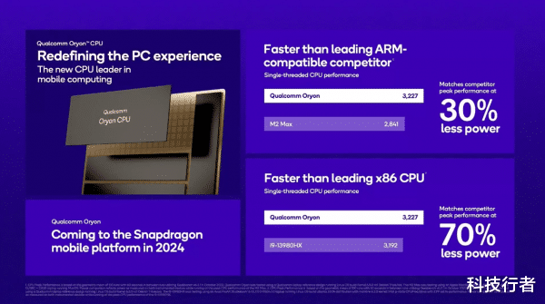 但为了实现这一切,个人电脑需要达到新一代的处理能力,这就对其主要的处理引擎——CPU提出了更高要求。在去年骁龙峰会上,高通曾提到从四五年前开始研发一个全新定制的Oryon CPU,而这一次,高通就放出了本场最大一匹黑马:骁龙X Elite。