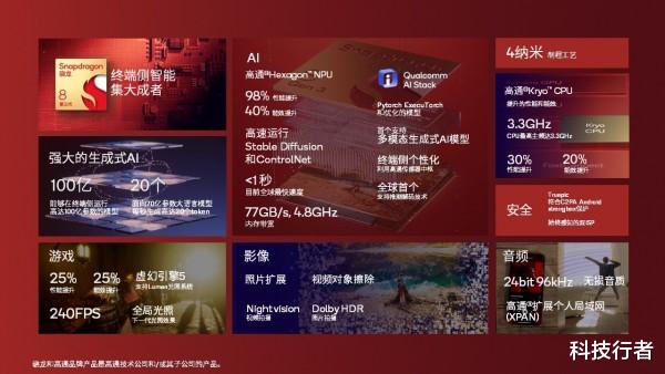峰会上,高通还发布了首个专为生成式AI而精心打造的移动平台:骁龙8Gen3(第三代骁龙8)。Gen意指Generation(代),而生成式AI全称是Generative AI,两个“Gen”正好不谋而合成了双关,高通也在骁龙8Gen3的宣传片中巧妙的用“Gen1、Gen2,Gen AI”的文字梗,来引出“骁龙Gen 3”的“生成式Generative AI”特性。