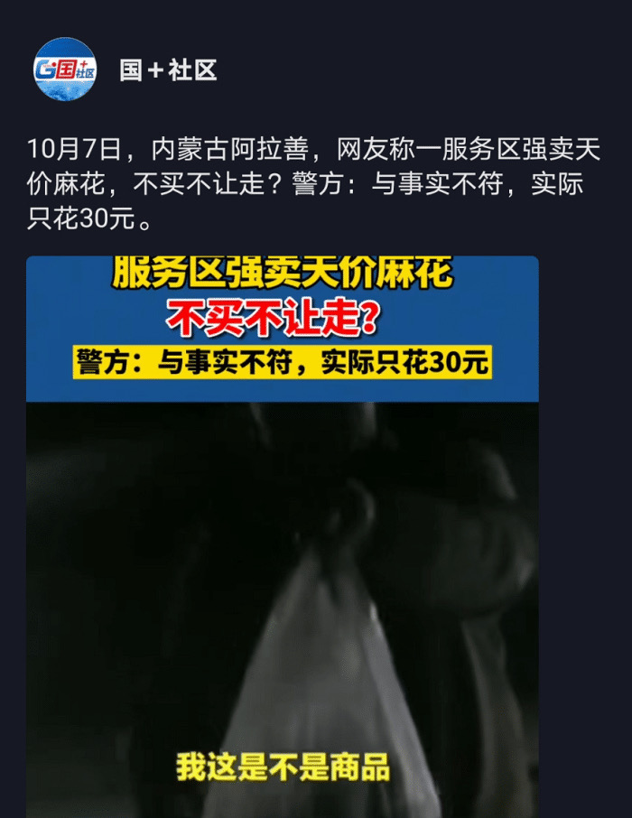 10月7日,内蒙古阿拉善发生了售卖天价麻花的事件,一个女子报警,称自己遇到了强买强卖。经过调查,这个女子所说的并不是事实,她遇到的不算强买强卖。因为她已经让老板敲碎了麻花,最后却觉得价格太贵不想买了。老板自然不愿意,所以才有了报警的后续。