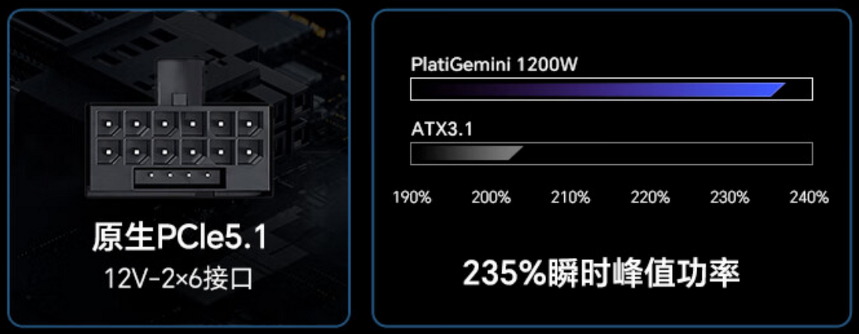 在性能方面,安耐美PalatiGemini 1200W不仅满足了原生PCIe5.1 12V-2x6-600W输出标准,更是超越了传统的规范。其瞬时峰值功率高达235%,可为高效显卡提供高达55A的连续电流,超过了Intel ATX3.1标准的2倍瞬时动态标准,提供了更高的额定功率输出,同时保证电脑系统的稳定性和可靠性。