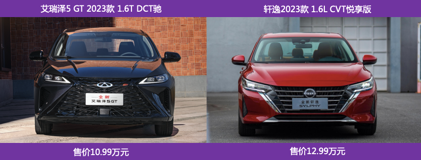 为了方便大家理性选择,小编挑选了两款车型中的热销车型:即售价10.99万元的全新艾瑞泽5 GT 2023款 1.6T DCT驰(下称艾瑞泽5 GT),售价12.99万元的轩逸2023款 1.6L CVT悦享版(下称轩逸)同台PK,通过在造型、空间、动力、配置等方面的对比,在价格有差异化的情况下,看看谁更具备高价值以及推进A级家轿市场加速内卷的实力。