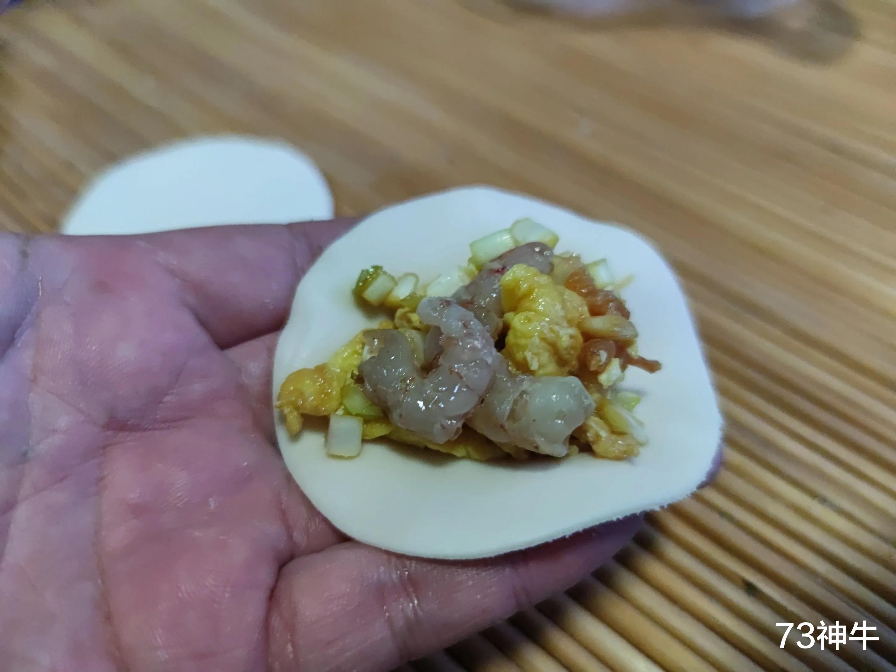 4.把调好的馅料包入饺子皮中,封口的时候包入整只的虾仁,捏紧口后入沸水锅中煮至饺子鼓肚浮起后成熟后即可出锅享用。