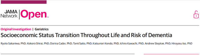 [1] Sakaniwa R, Shirai K, Cador D, et al. Socioeconomic Status Transition Throughout Life and Risk of Dementia[J]. JAMA Network Open, 2024, 7(5): e2412303-e2412303.