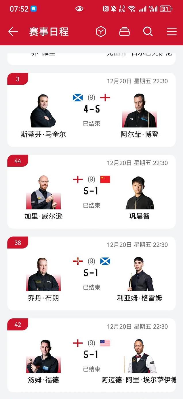 斯佳辉和巩晨智只能留守英国,备战。接下来世界公开赛结束之后的世锦赛的比赛。另外的角逐当中,名将方面几乎是没有冷门出现像吉米罗伯逊汤姆福德等拿过排名赛冠军的球员都已经杀入到了接下来的世界公开赛的正赛行列当中,而前,威尔士公开赛冠军得主乔丹布朗同样是挺身而出顺利,突围杀入到了世界界公开赛的正赛。而世界公开赛同时进行的沙特利雅得大师赛马克艾伦夺得最后的冠军。