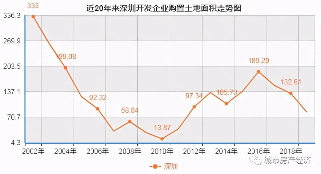 通过上图近20年来深圳开发企业购置土地面积走势图来看,深圳供应土地的最高峰是在2002年左右也不过才333万平方米。如果说2016年后深圳房价上涨跟可出让土地资源过少有关系,那么2010年深圳开发企业购置土地面积只有13.87万平方米就不得不说是一个谜了。单独看数据大家或许没有直接感觉,以2019年为例,2019年深圳房地产开发企业购置土地面积只有83.33万平方米;北京房价虽然也高,但是起码还有144.03万平方米作为补充。换句话说,为何在2020年3月份全国房价开始大涨的城市出现在深圳?这个都是前些年(2016年后深圳出让土地面积持续走低)土地供应不足,市场恐慌性购房情绪积累的结果。